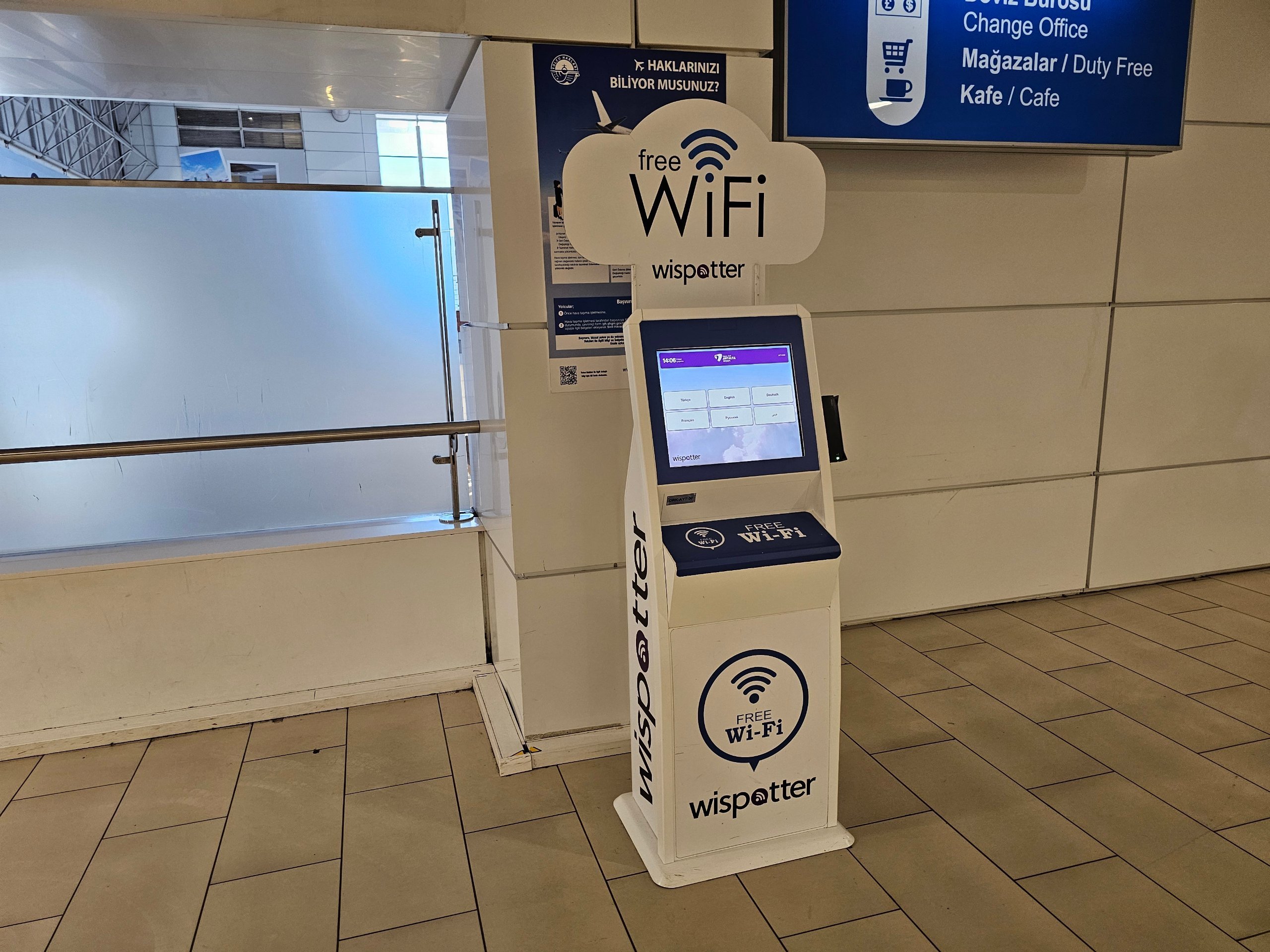 Το δωρεάν Wi-Fi είναι διαθέσιμο μόνο για 60 λεπτά. Ο κωδικός πρόσβασης μπορεί να ληφθεί μόνο από τα επίσημα περίπτερα που βρίσκονται σε όλο το αεροδρόμιο, όπου πρέπει να εισάγετε είτε έναν πραγματικό αριθμό τηλεφώνου είτε να σαρώσετε το διαβατήριό σας.