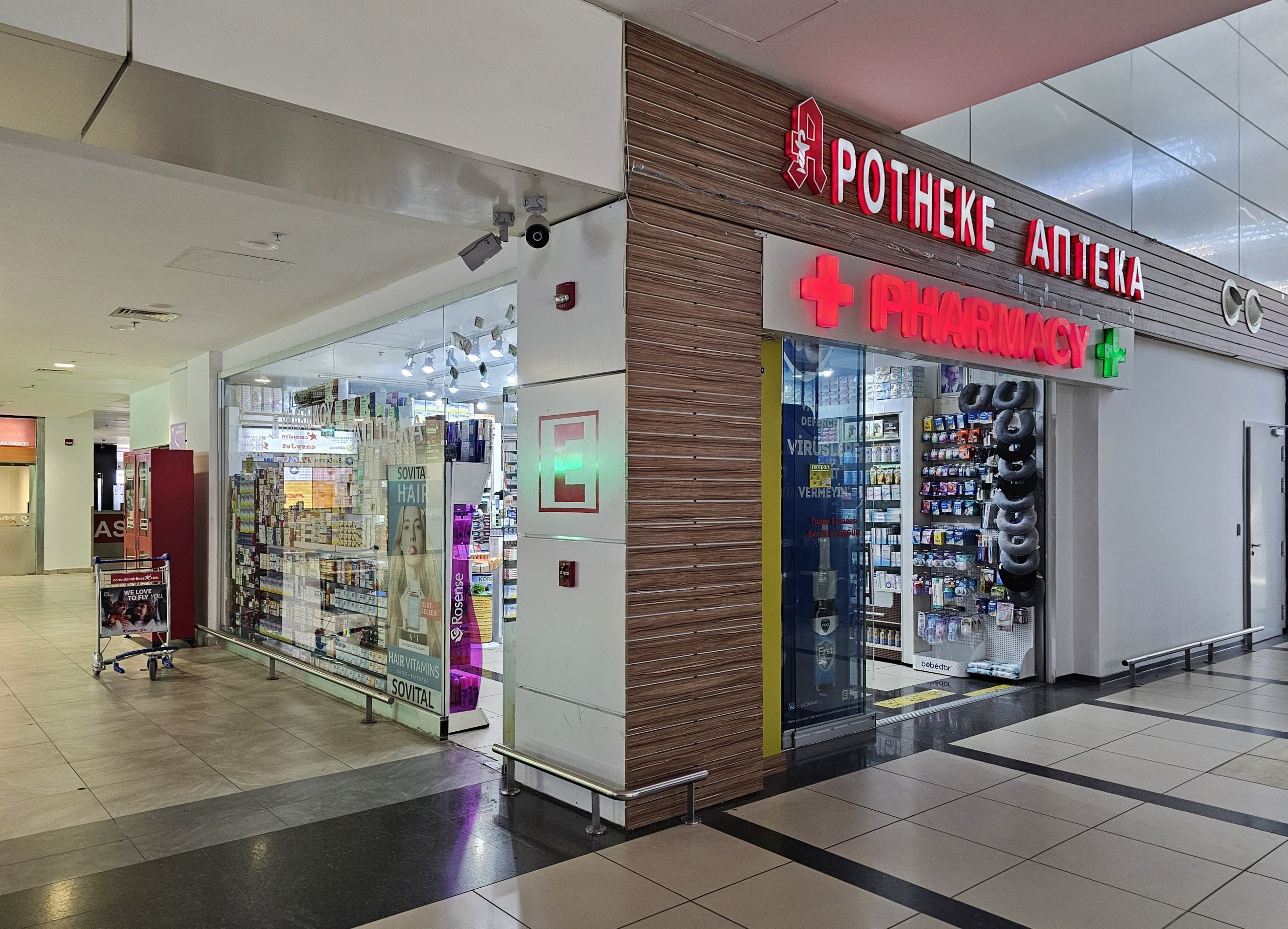 Φαρμακεία θα βρείτε στους κοινόχρηστους χώρους και των δύο αεροσταθμών (ανοιχτά 24 ώρες το 24ωρο στον αεροσταθμό 1, ανοιχτά 9:00-18:00 στον αεροσταθμό 2).