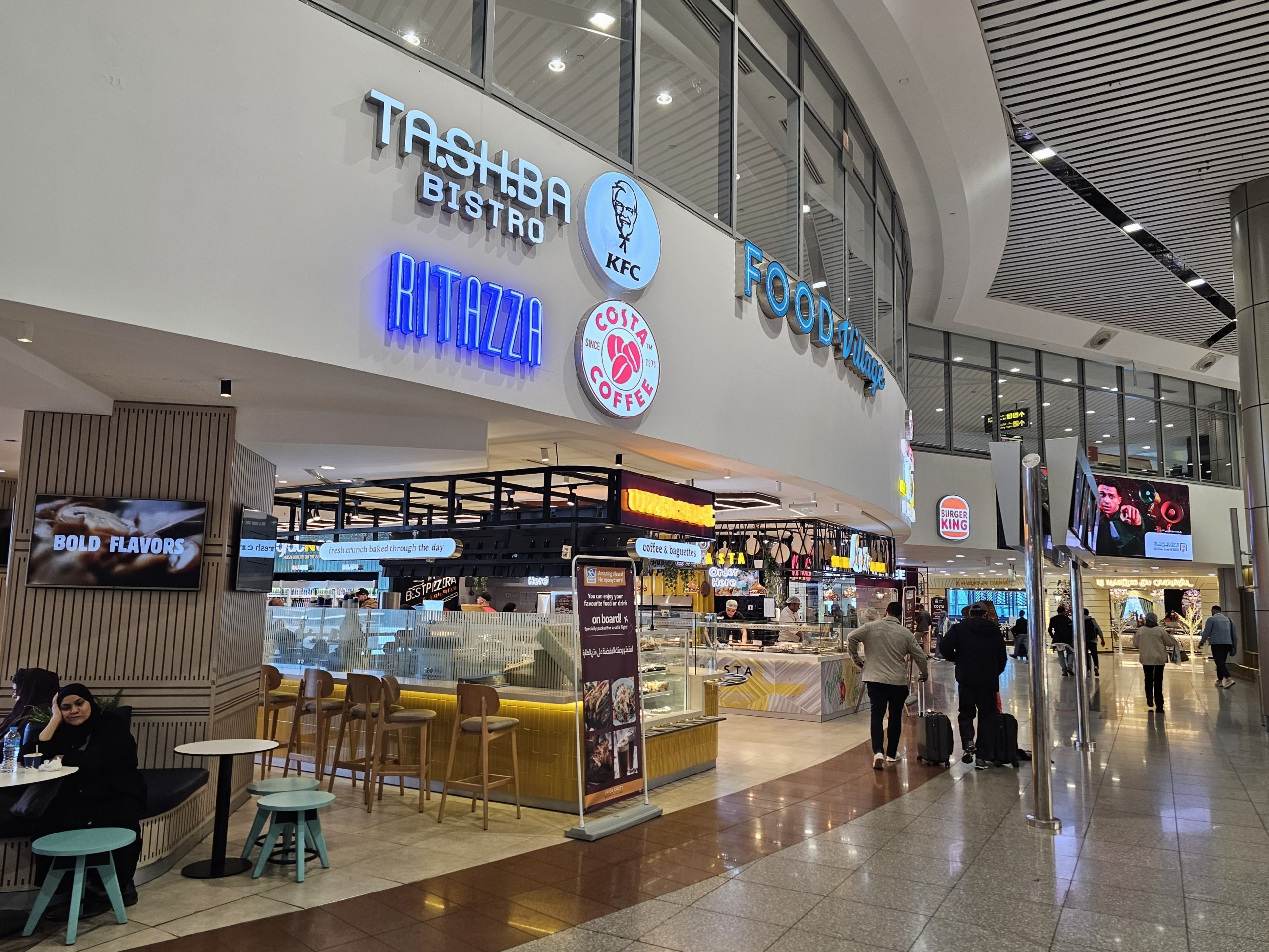 Τα περισσότερα εστιατόρια βρίσκονται μετά τον έλεγχο ασφαλείας και είναι συνήθως ανοιχτά 24 ώρες το 24ωρο.