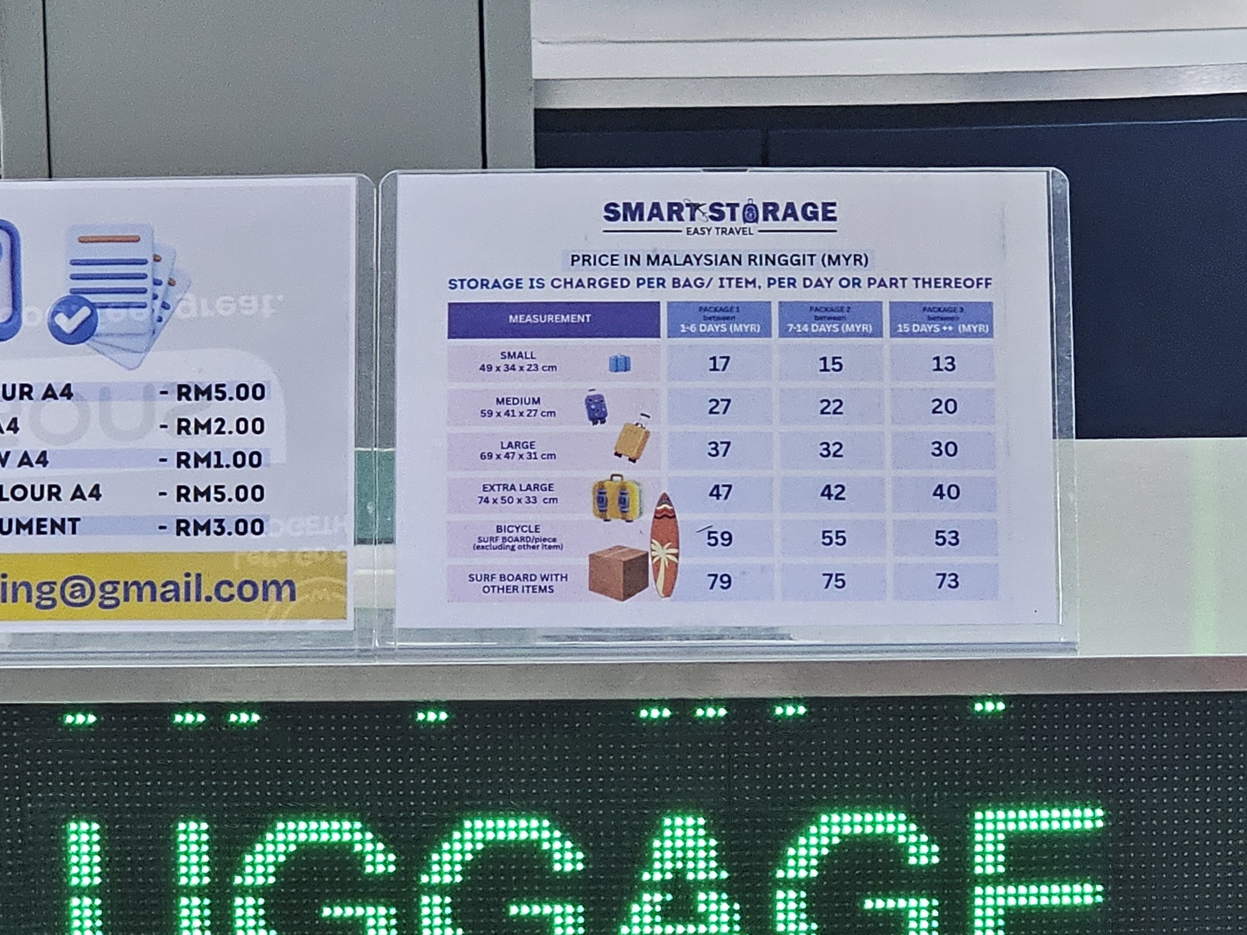 Θα πληρώσετε για την ολοήμερη αποθήκευση ανάλογα με το μέγεθος των αποσκευών σας από 17 myr έως 50 myr.