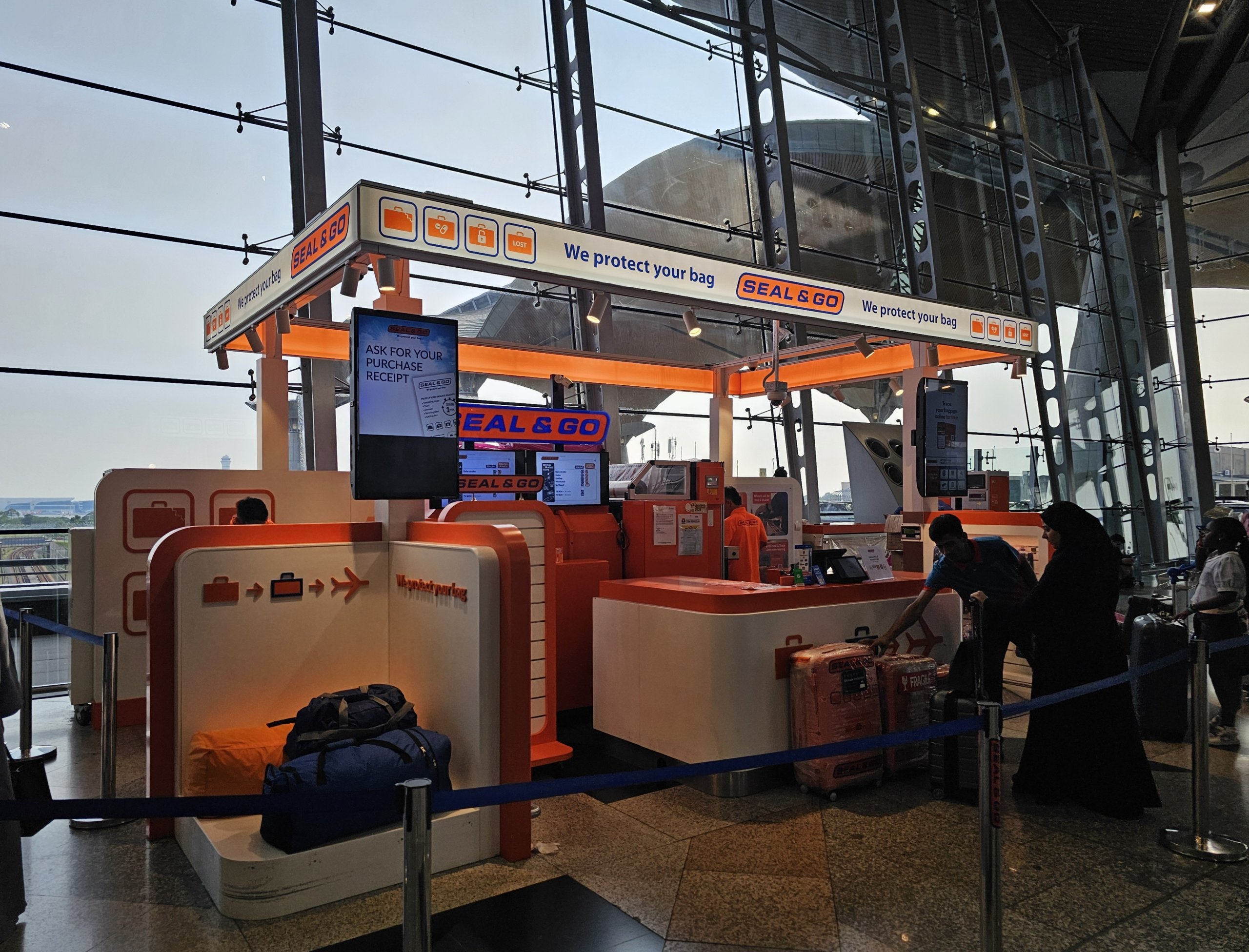 Υπάρχουν διάφορα περίπτερα στην αίθουσα αναχωρήσεων και στους δύο τερματικούς σταθμούς, όπου μπορείτε να τυλίξετε τις αποσκευές σας σε προστατευτική μεμβράνη με χρέωση 50 μυρίων.