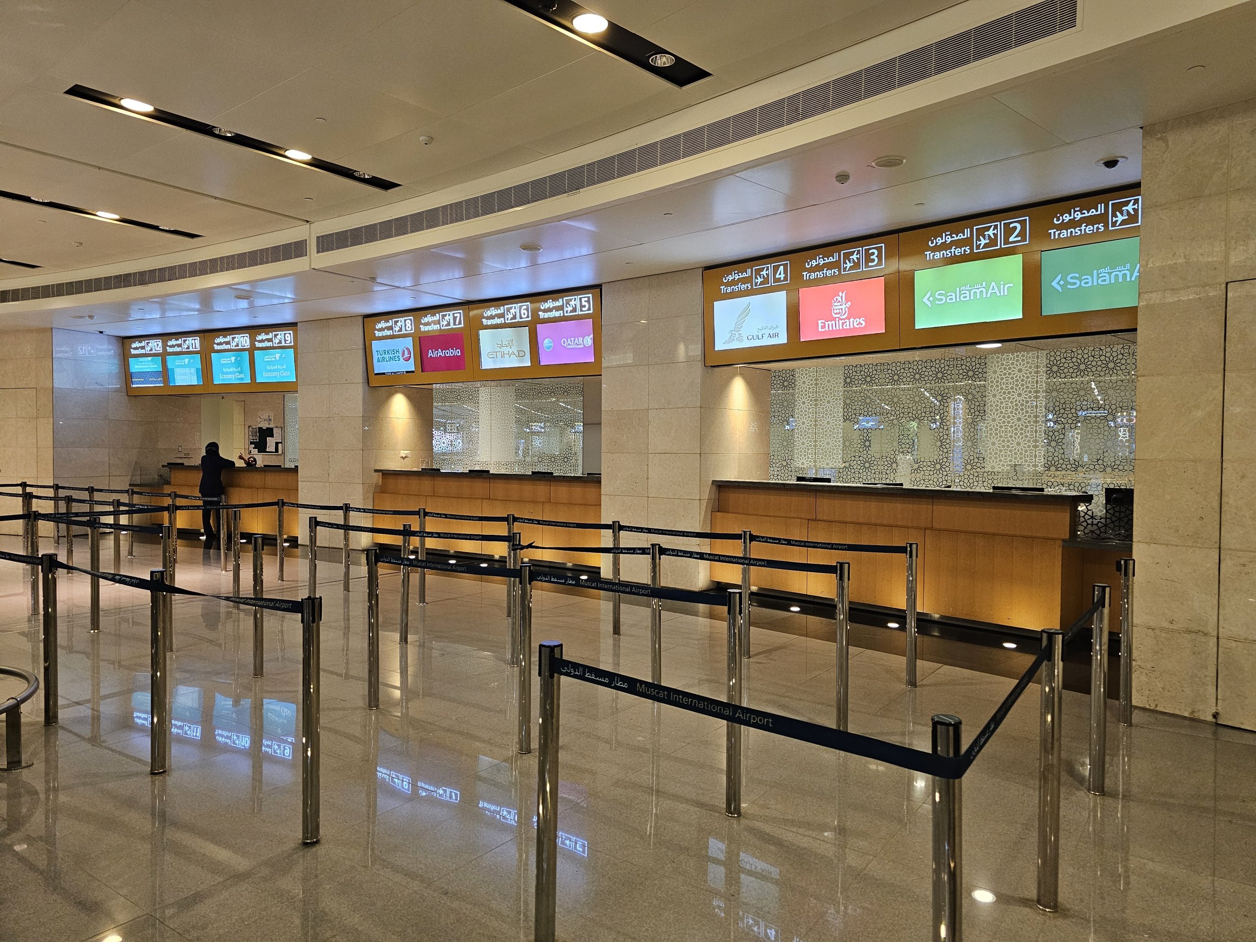 Ο ελάχιστος χρόνος μετεπιβίβασης στο αεροδρόμιο του Μουσκάτ είναι 60 λεπτά, αλλά συνήθως μπορείτε να μετεπιβιβαστείτε από αεροπλάνο σε αεροπλάνο μέσα σε 30 λεπτά.