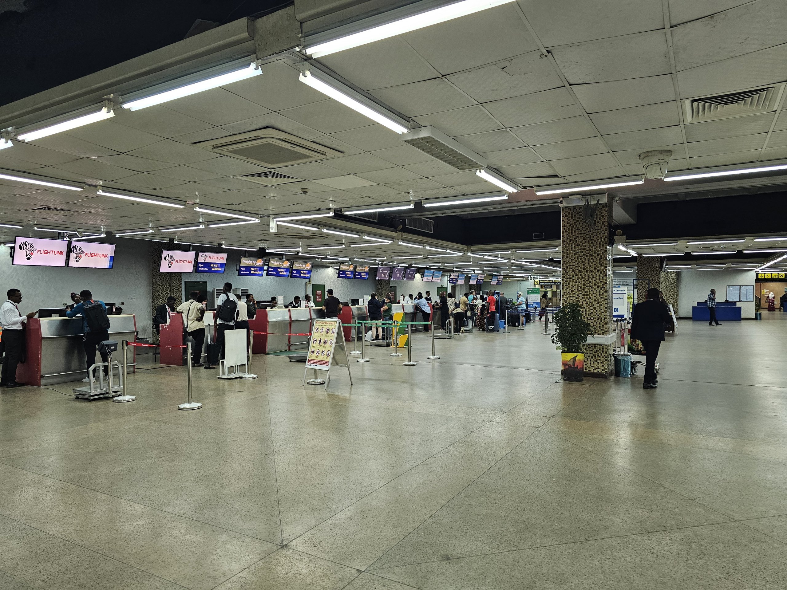 Με εξαίρεση τις πτήσεις με την Precision Air ή την Flightlink, οι οποίες κάνουν check in για πτήσεις εσωτερικού και εξωτερικού στον τερματικό σταθμό 2, σε όλες τις άλλες περιπτώσεις πρέπει να περπατήσετε επιπλέον τον διάδρομο μήκους 200 μέτρων μεταξύ των τερματικών σταθμών 2 και 3.