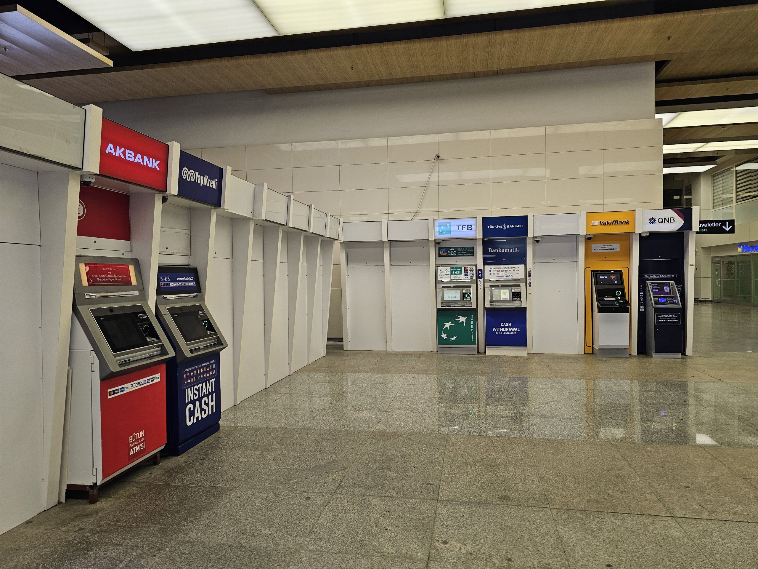 Τα ΑΤΜ των συνηθισμένων τουρκικών τραπεζών βρίσκονται σε πολλά σημεία στις αίθουσες αφίξεων και των δύο τερματικών σταθμών.