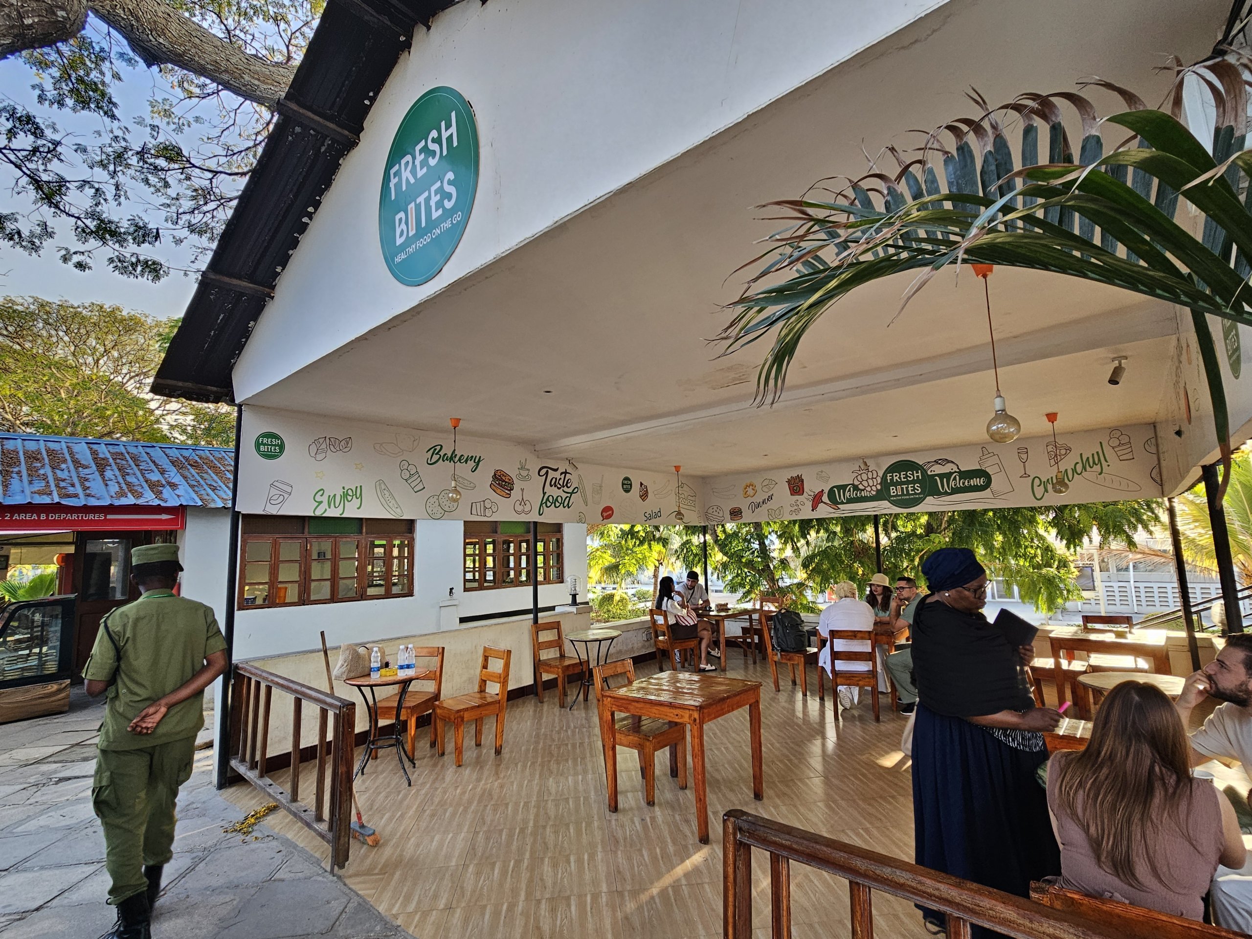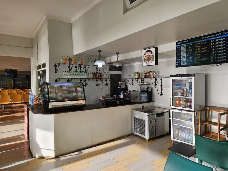 Στον διεθνή τερματικό σταθμό θα βρείτε ένα εστιατόριο, ένα μπαρ και ένα μικρό μπιστρό μετά τον έλεγχο ασφαλείας. Οι τιμές εδώ είναι αρκετές φορές υψηλότερες από ό,τι οπουδήποτε αλλού στη Ζανζιβάρη.