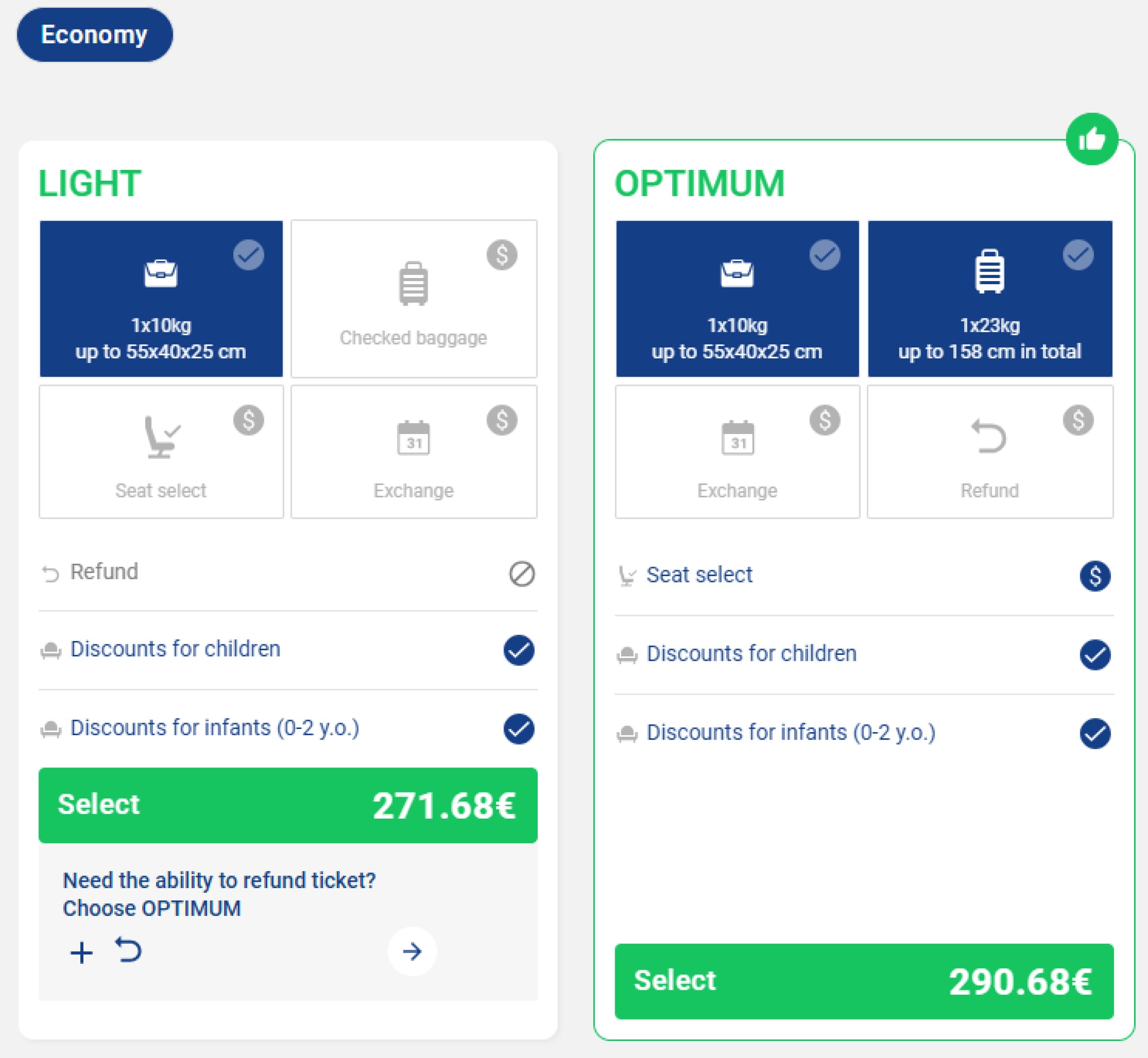 - Optimum - Χειραποσκευές και παραδοτέες αποσκευές έως 23 kg, επιλογή θέσης με χρέωση, αλλαγές και ακυρώσεις επιτρέπονται με χρέωση.