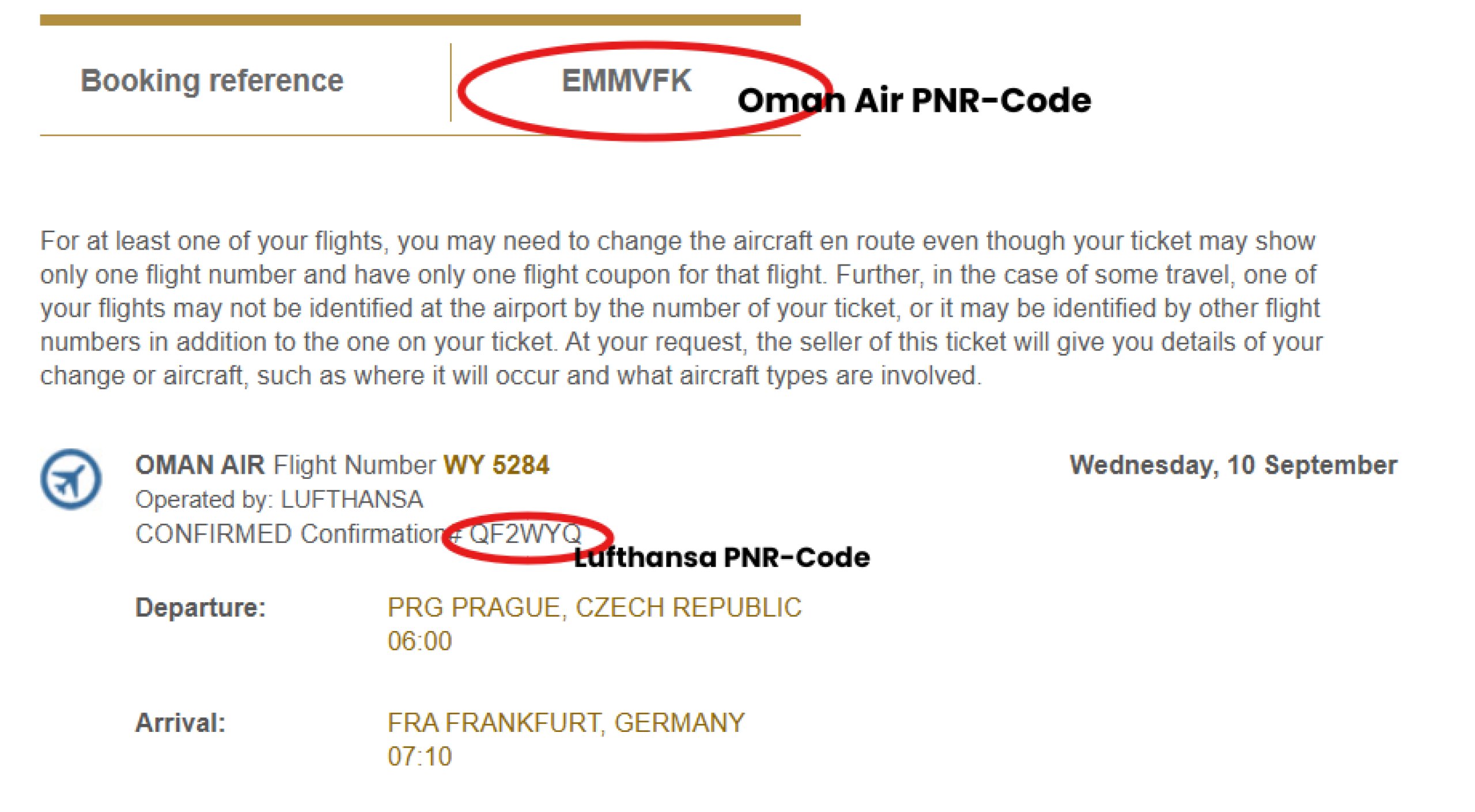 Όλες οι πτήσεις αγοράστηκαν ως μία κράτηση, ωστόσο η πτήση της Lufthansa από την Πράγα στη Φρανκφούρτη είχε διαφορετικό κωδικό PNR από την πτήση της Oman Air από τη Φρανκφούρτη FRA μέσω Muscat MCT στη Ζανζιβάρη ZNZ.