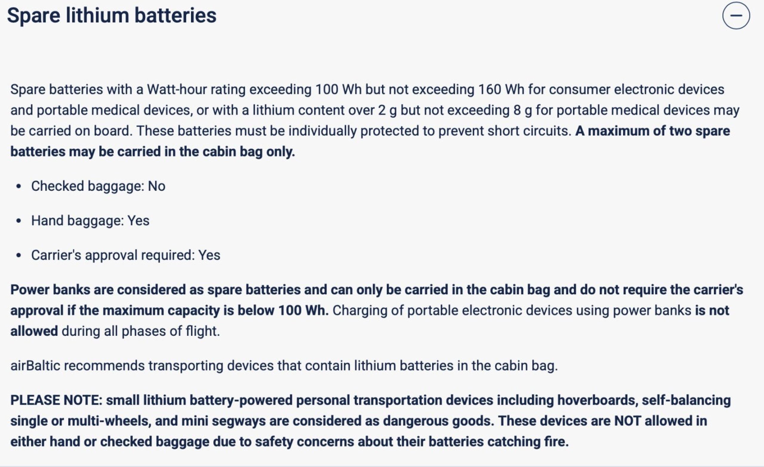 Ορισμένες αεροπορικές εταιρείες επιτρέπουν ένα power bank 160 Wh / 43.200 mAh χωρίς περιορισμό, ενώ σε άλλες αεροπορικές εταιρείες πρέπει να ζητήσετε εκ των προτέρων άδεια για τη μεταφορά ενός power bank με χωρητικότητα μεγαλύτερη από 100 Wh και μικρότερη από 160 Wh.