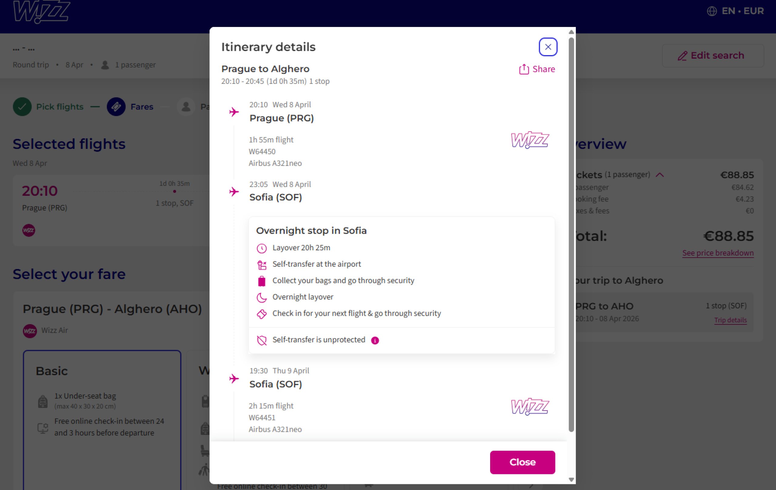- ❌ εγγύηση της ίδιας της μεταφοράς - εάν η πρώτη πτήση καθυστερήσει ή ακυρωθεί, η Wizz Air δεν θα παρέχει επιστροφή χρημάτων για τη δεύτερη πτήση
