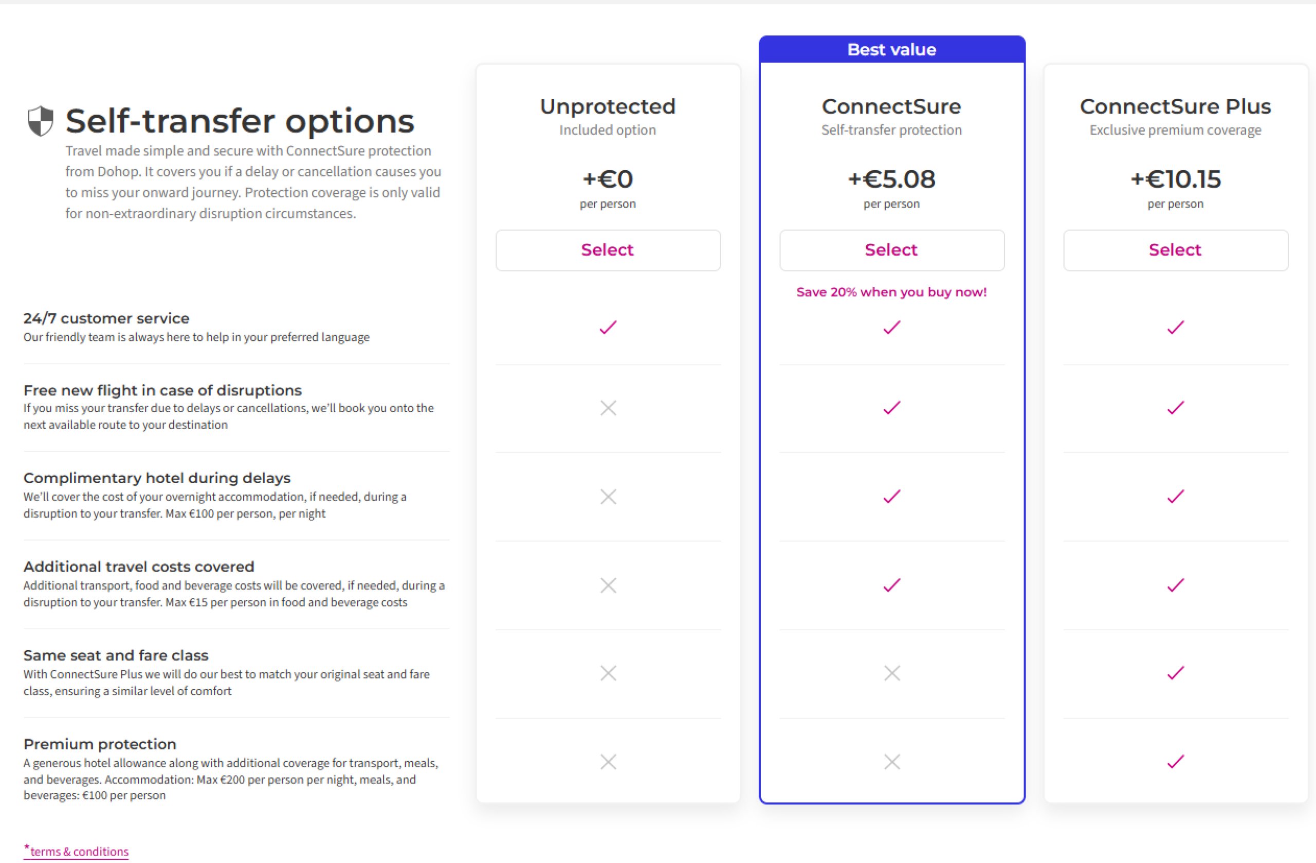 Αυτή η υπηρεσία κοστίζει μεταξύ 5 και 11 ευρώ (ανάλογα με το συγκεκριμένο δρομολόγιο) και περιλαμβάνει τις ακόλουθες παροχές για καθυστερημένες/ακυρωμένες πτήσεις και χαμένες πτήσεις ανταπόκρισης: