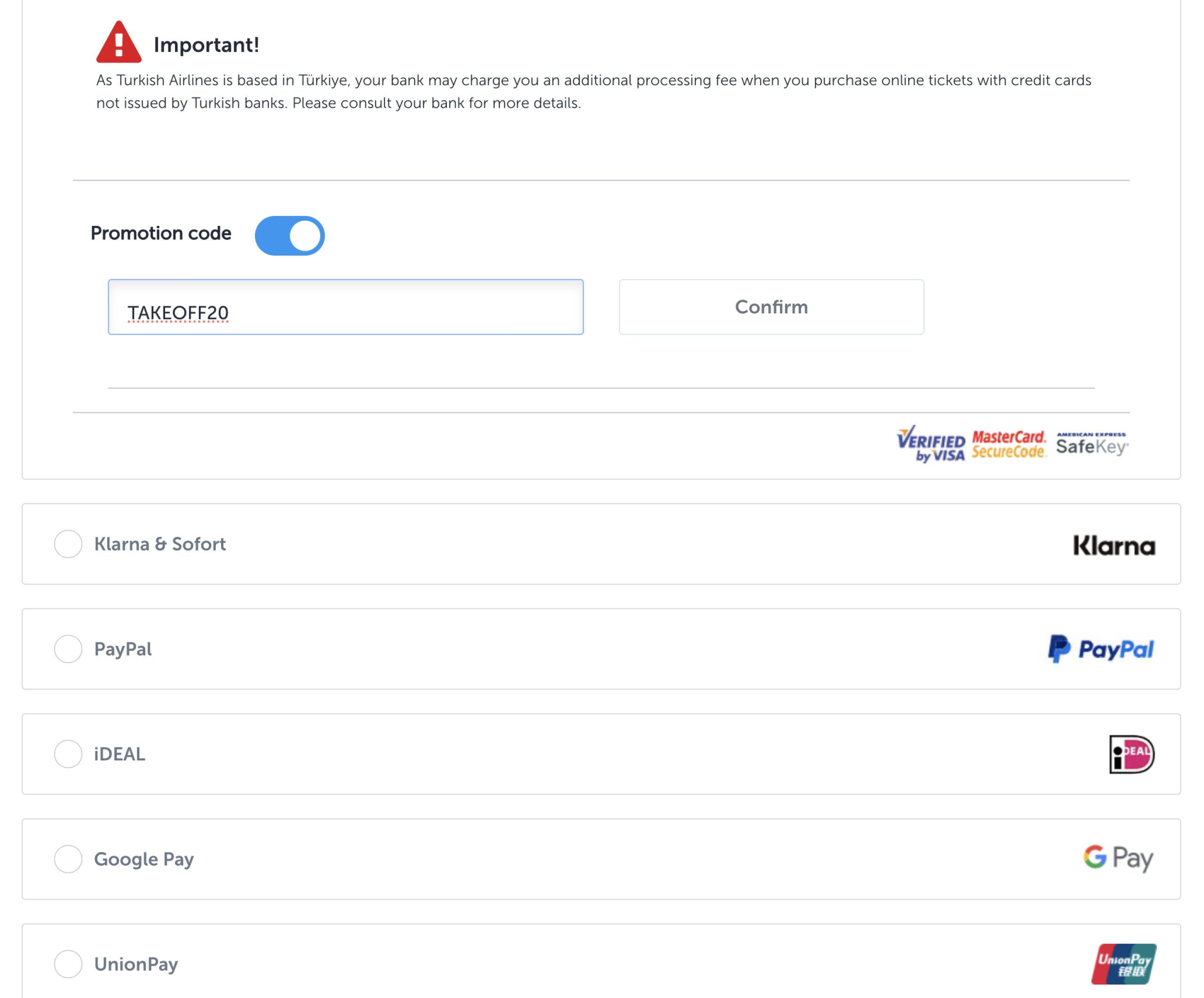 Μπορείτε να εφαρμόσετε τον κωδικό προσφοράς της Turkish Airlines στην τελική σελίδα πληρωμής.