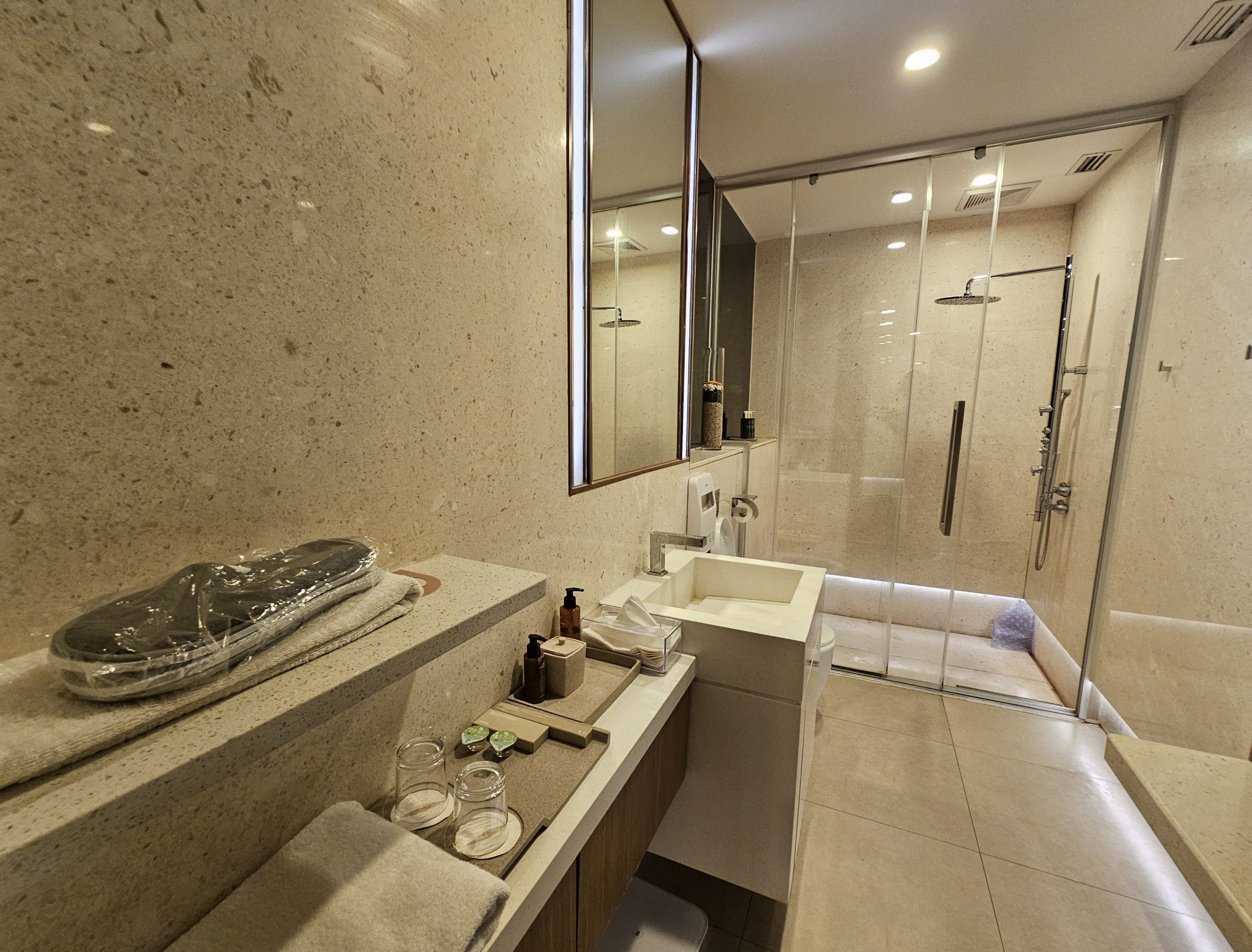 Υπάρχει επίσης ένα ευρύχωρο και καθαρό ντους, το οποίο προσωπικά μπορώ να εκτιμήσω ιδιαίτερα μεταξύ μακρινών πτήσεων.