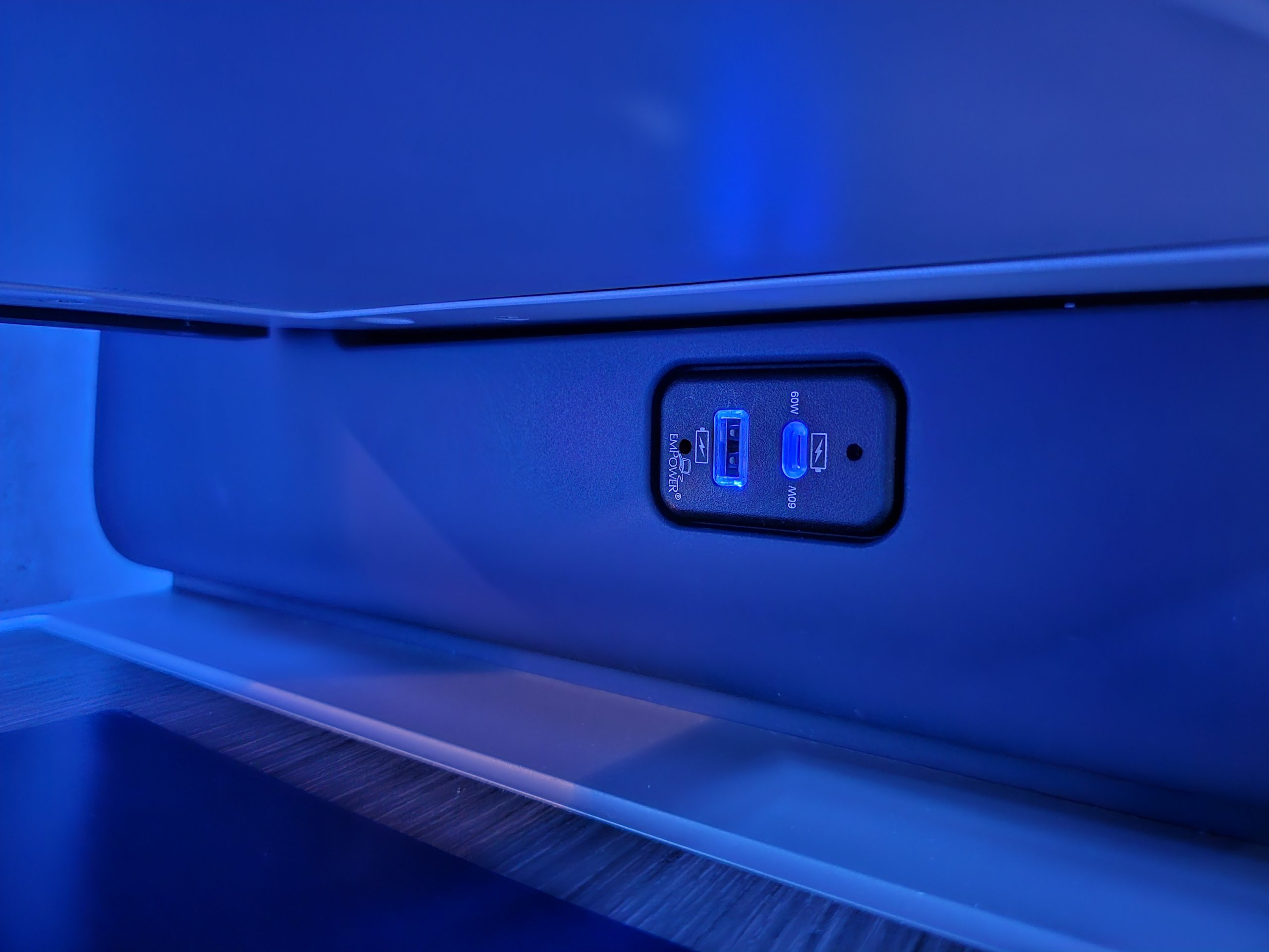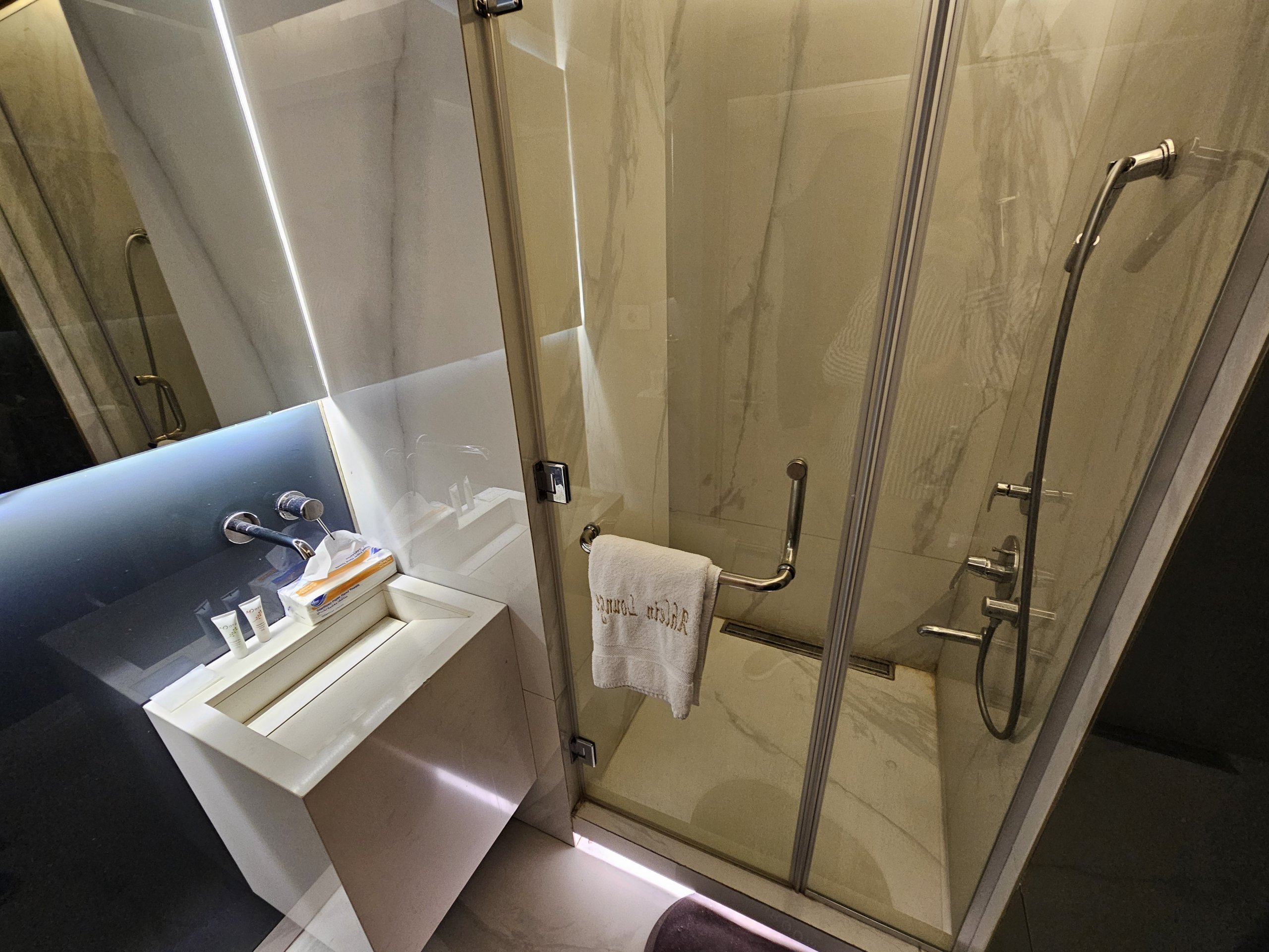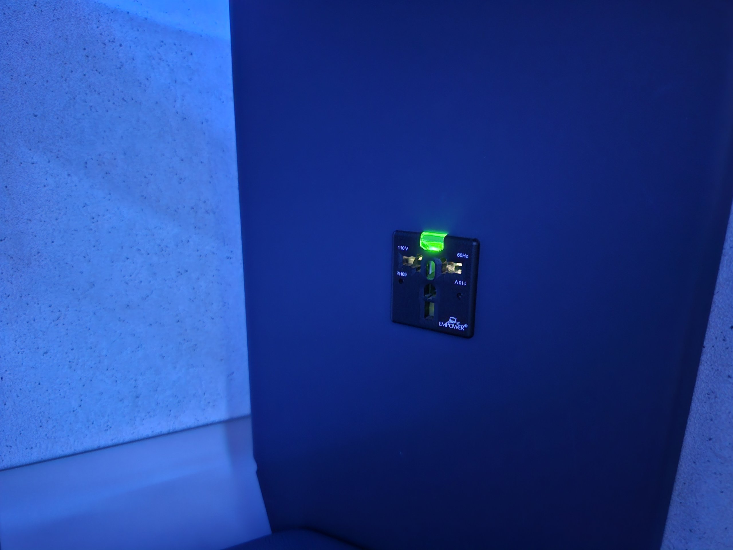 Η κομψή ατμόσφαιρα τονίζεται από τον μπλε νυχτερινό φωτισμό, καθώς η πτήση μας αναχωρεί στις 4:35 π.μ.