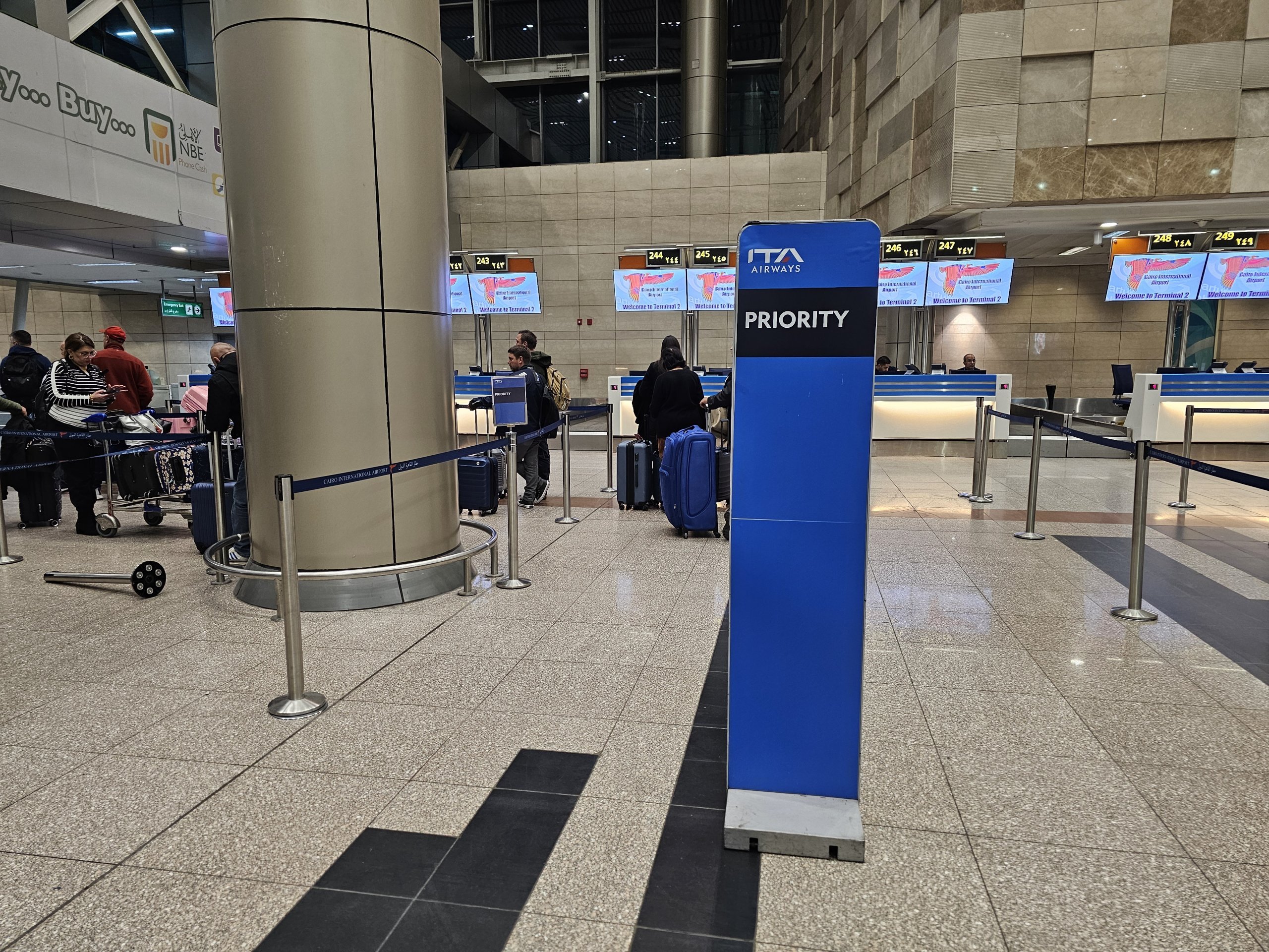Κάνω check-in στο αεροδρόμιο του Καΐρου, όπου η ITA Airways διαθέτει 5 ειδικά γκισέ check-in στον τερματικό σταθμό 2.