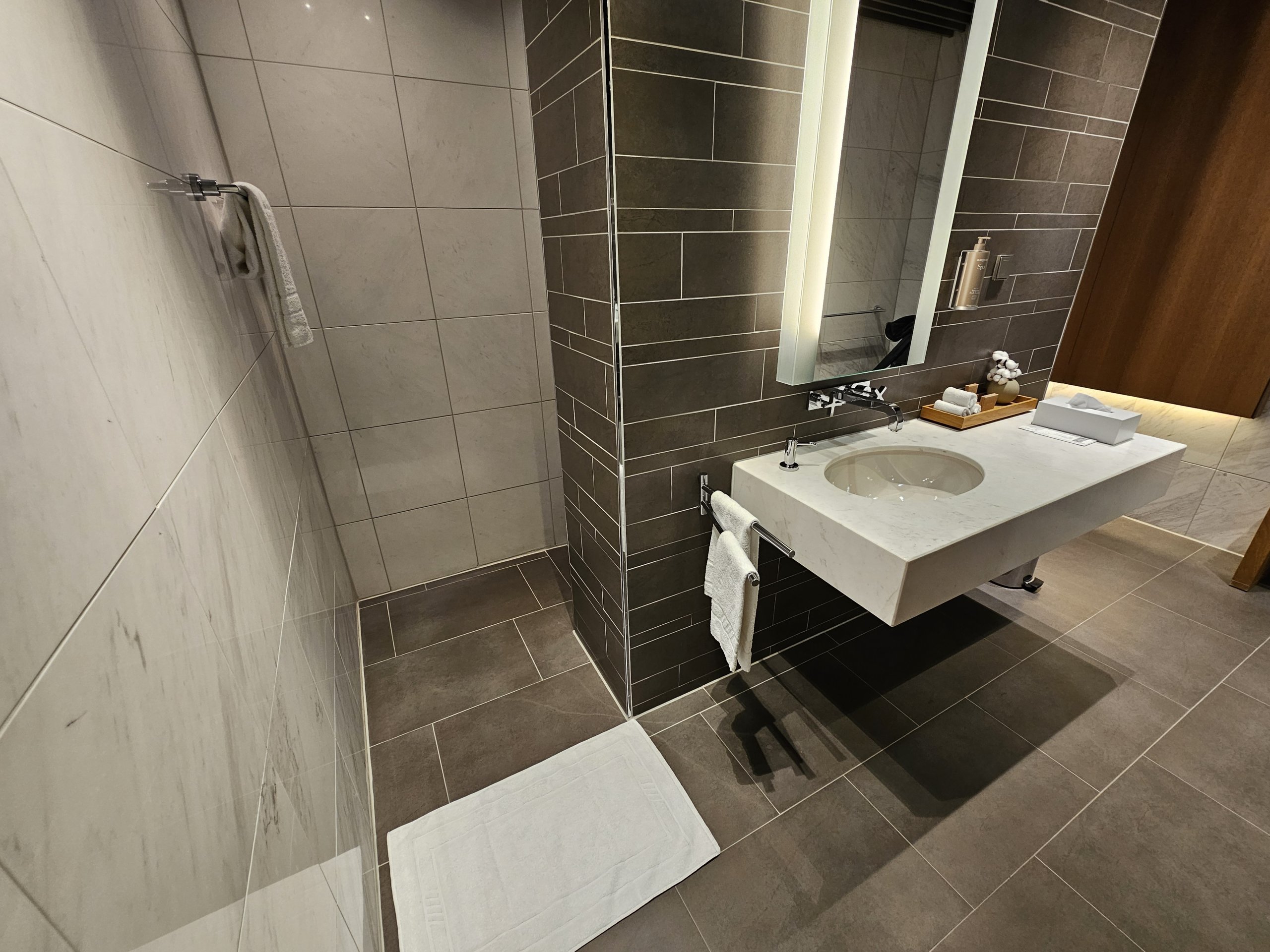 Παρόλο που η πτήση είναι σε business class, ολόκληρο το εισιτήριο έχει εκδοθεί ως πρώτης θέσης, οπότε μπορώ να κατευθυνθώ προς το First Class Lounge κατά την επιβίβαση.