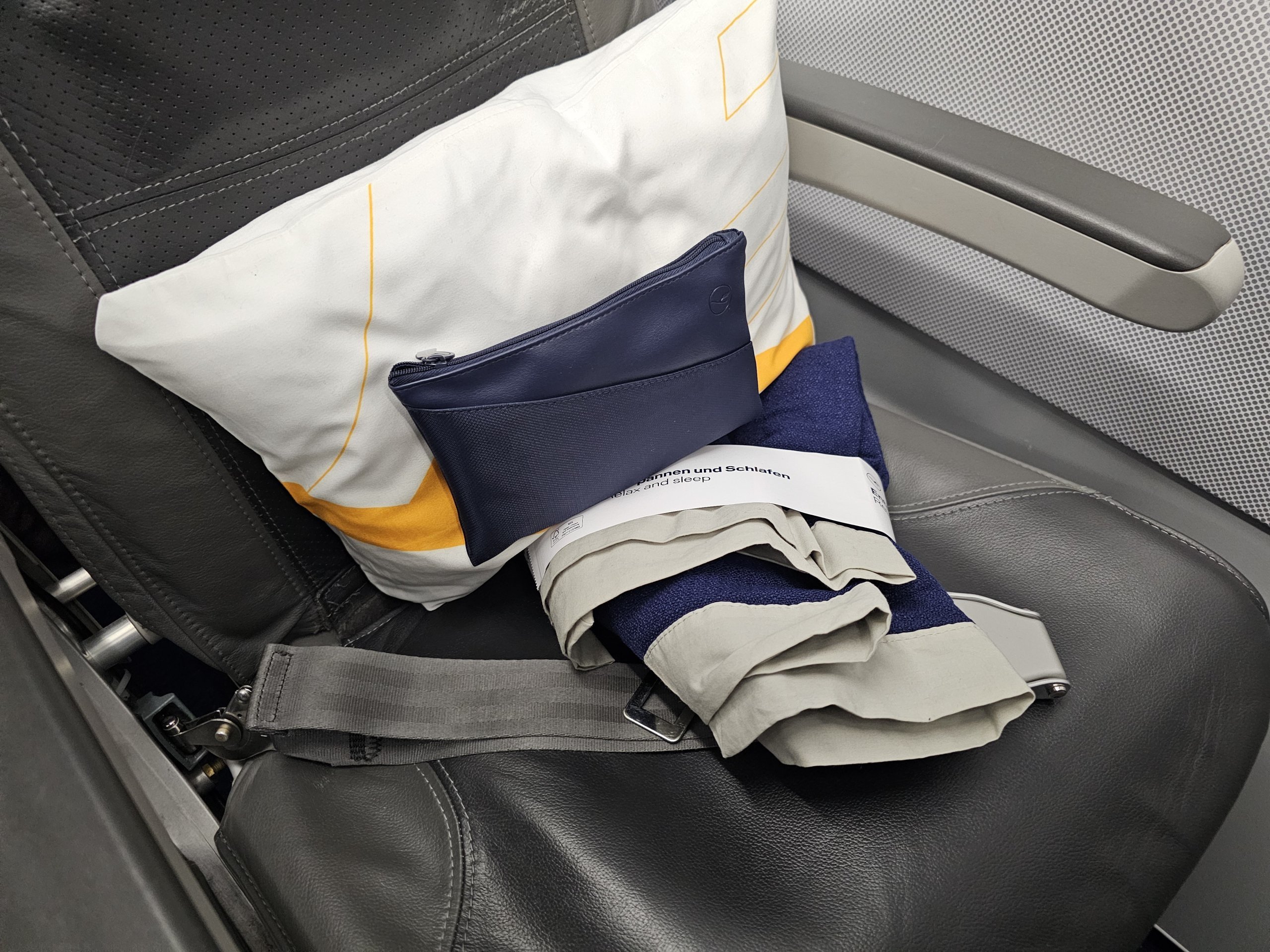 Ωστόσο, το περιεχόμενο του amenity-kit είναι λίγο φτωχότερο στη Lufthansa και το μαξιλάρι είναι επίσης μικρότερο. Μέσα στην τσάντα βρίσκω τα εξής πράγματα: