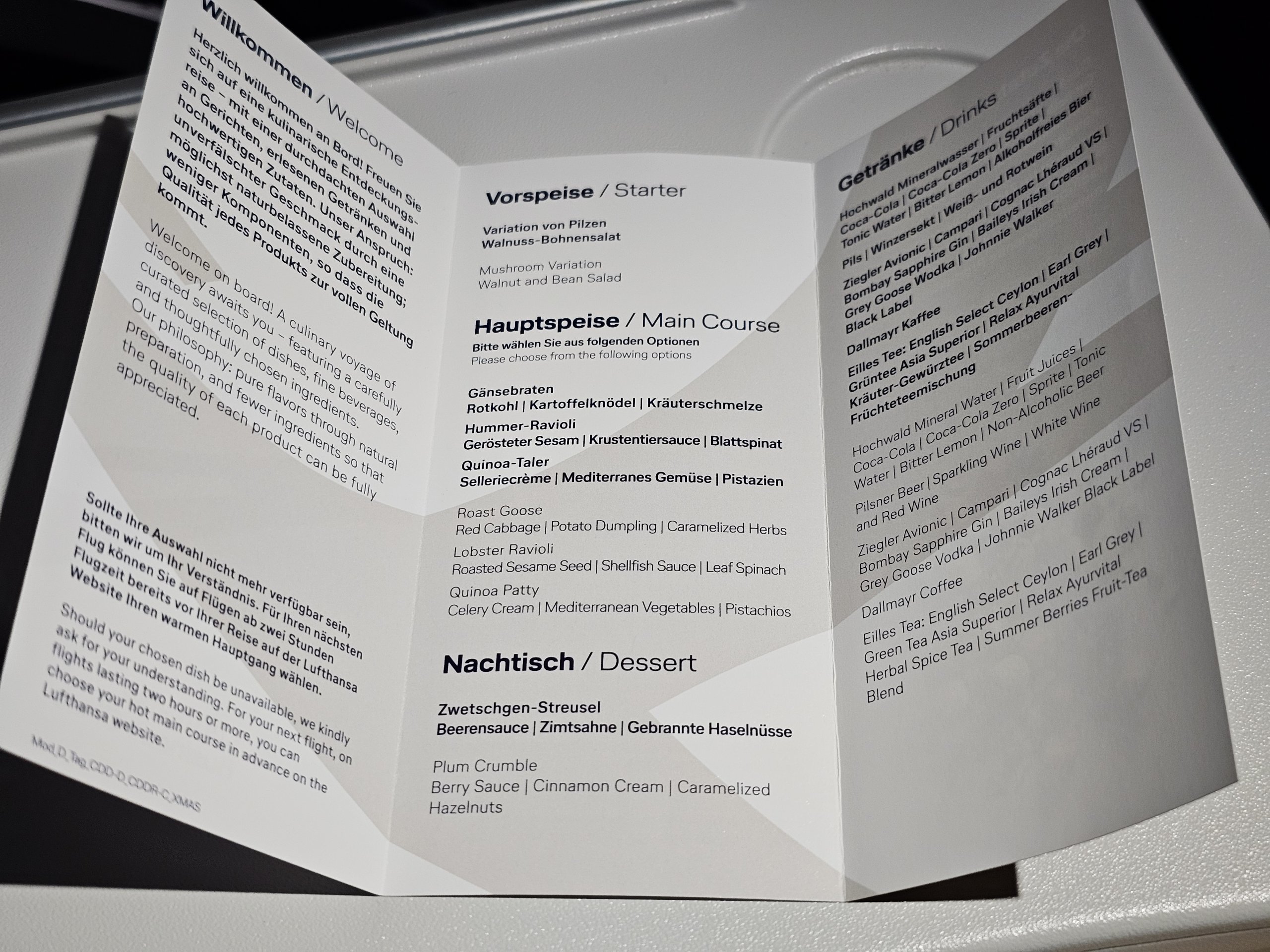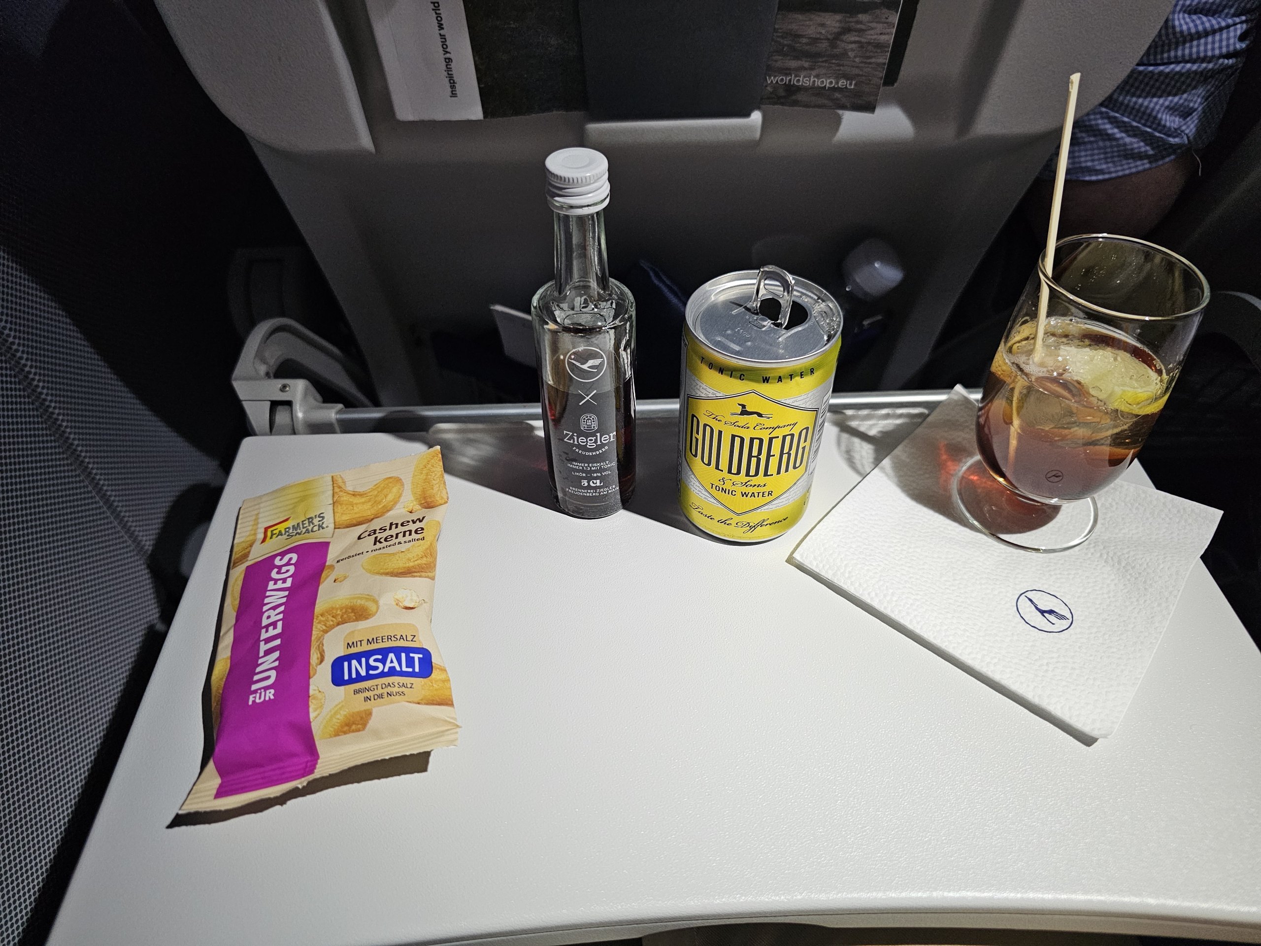 Περίπου 20 λεπτά μετά την απογείωση, η πρώτη υπηρεσία έρχεται με τη μορφή ενός ποτού και μιας σακούλας μπισκότων. Φυσικά έχω το αγαπημένο μου κοκτέιλ με το σήμα κατατεθέν της Lufthansa, το Avionic.