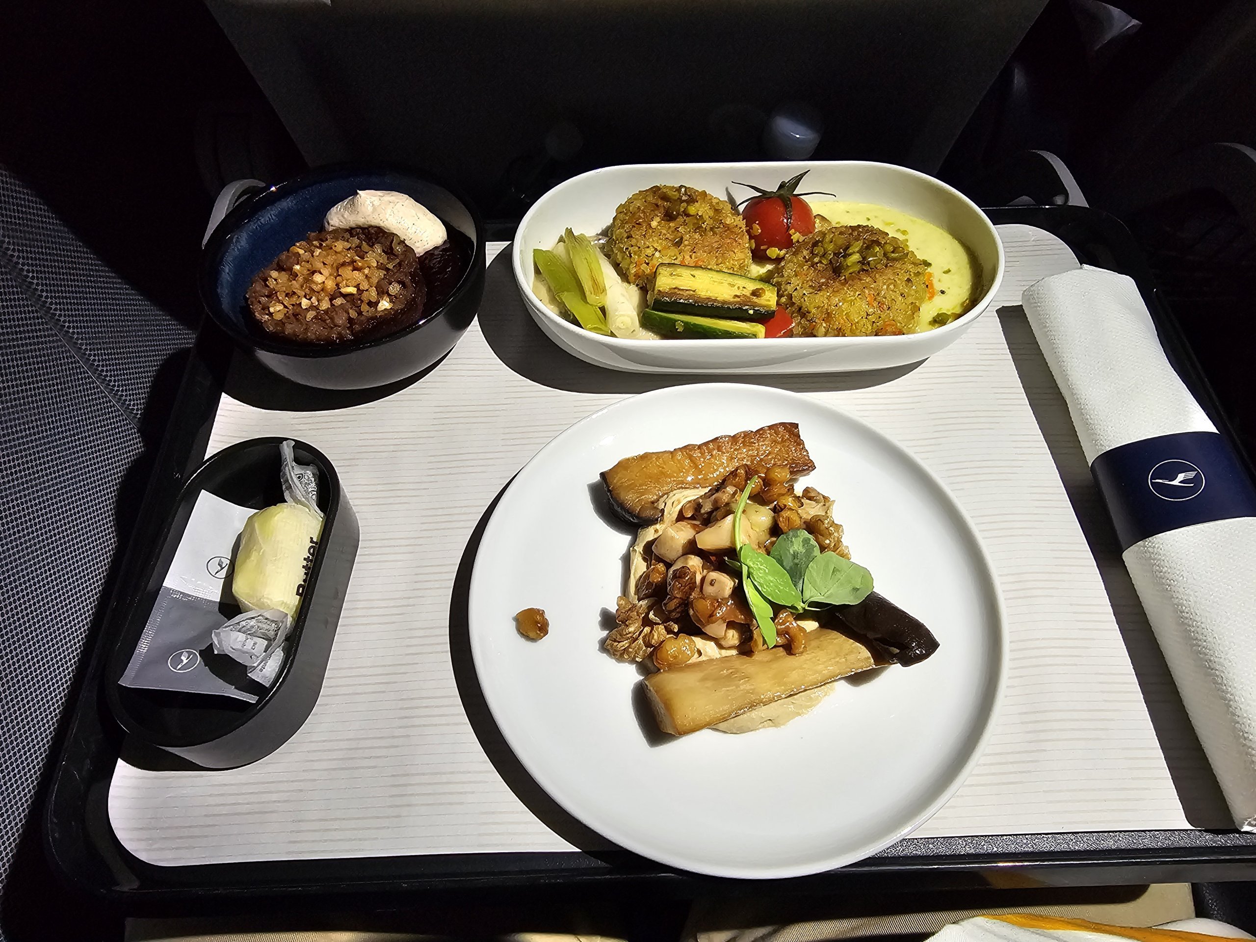 Έχω φάει καλύτερα γεύματα στο αεροπλάνο, η κινόα είναι αποξηραμένη και με φρυγανιά, οπότε το γεύμα δεν είναι τόσο ελαφρύ όσο περίμενα. Αλλά το ορεκτικό με τα μανιτάρια είναι υπέροχο και το crumble δαμάσκηνου είναι επίσης νόστιμο,