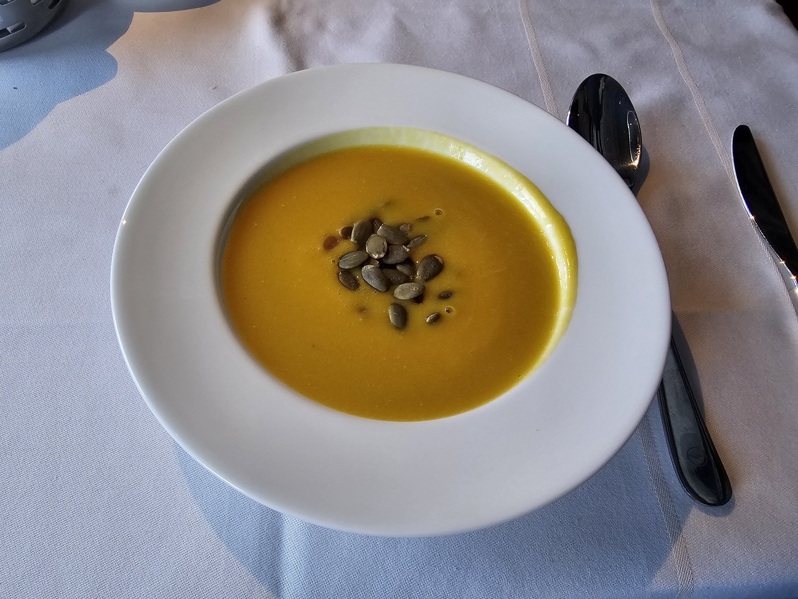 Πριν από το γεύμα μου τρώω μια υπέροχη σούπα κολοκύθας και τζίντζερ.