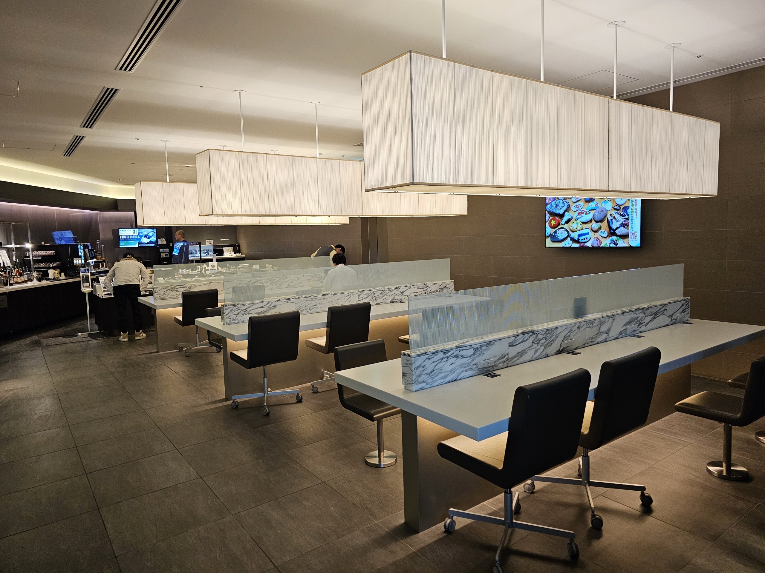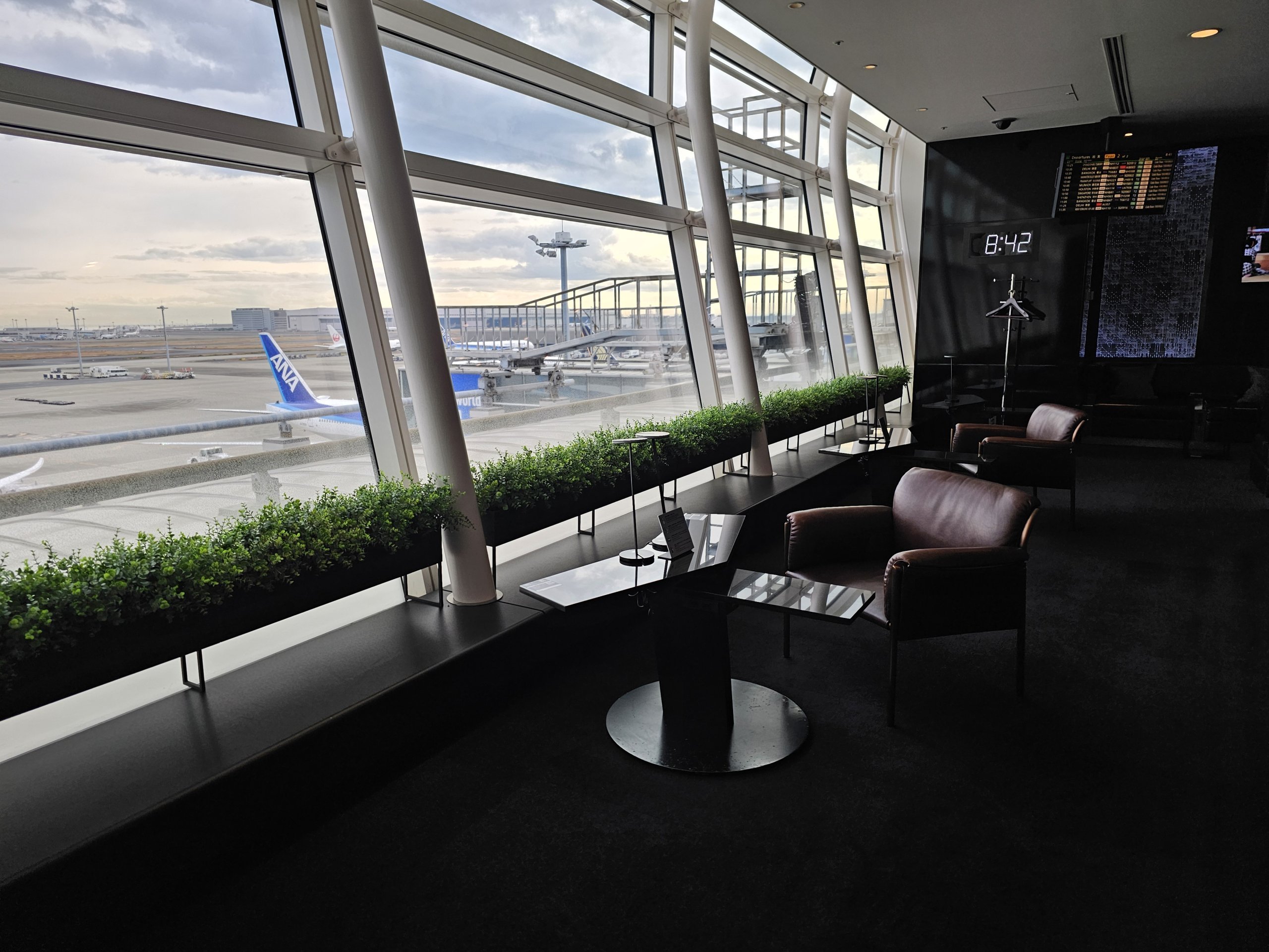 Η αίθουσα αναμονής είναι πολύ ευρύχωρη με εξαιρετική θέα στην πίστα και πολλές καμπίνες που μιμούνται τα καθίσματα πρώτης θέσης της ANA Japan Airlines.