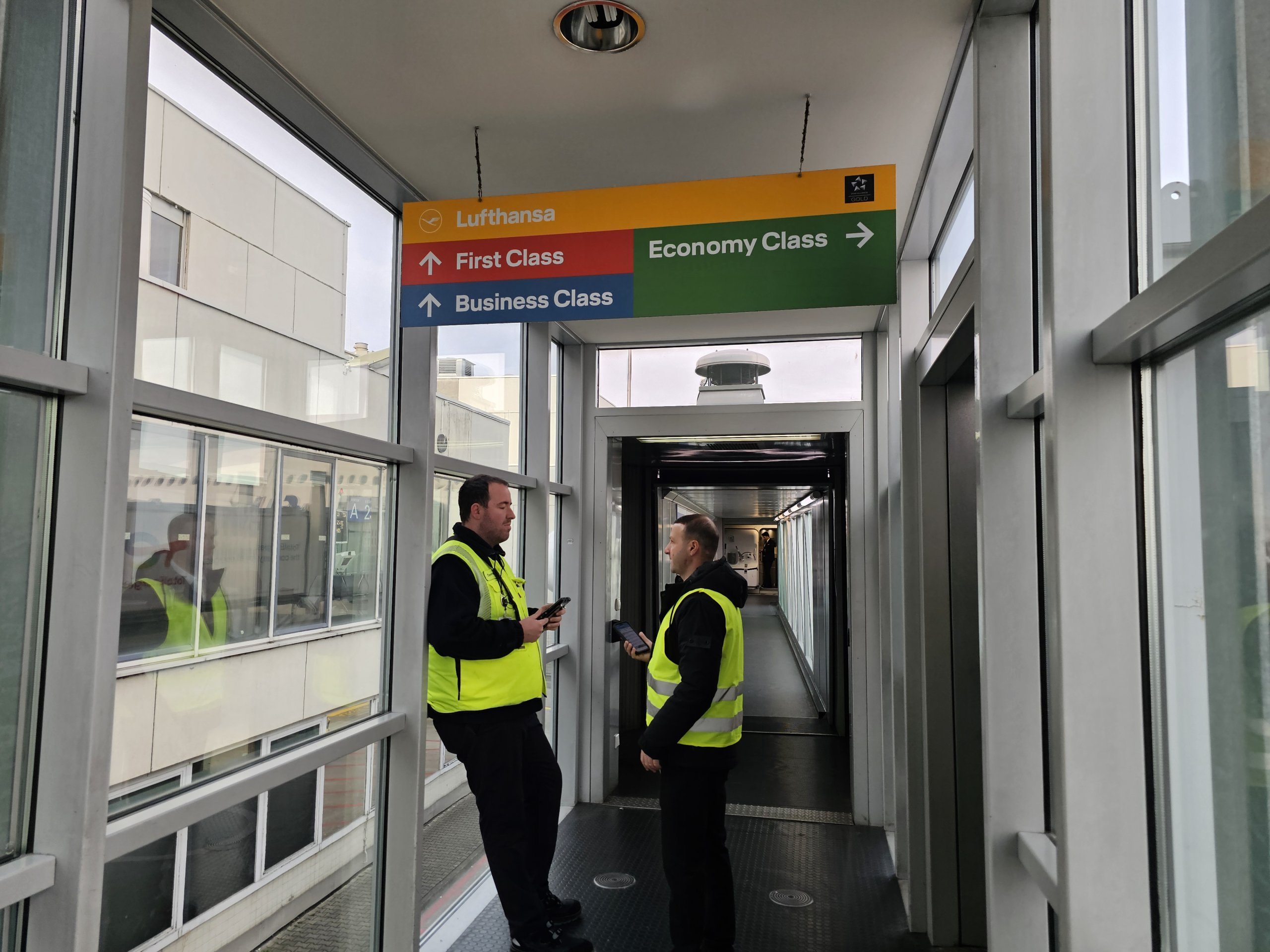Βγαίνουμε από το αυτοκίνητο στον διάδρομο προσγείωσης, όπου στη συνέχεια μπαίνουμε μέσα στο ασανσέρ που μας μεταφέρει στην τυπική γέφυρα επιβίβασης.