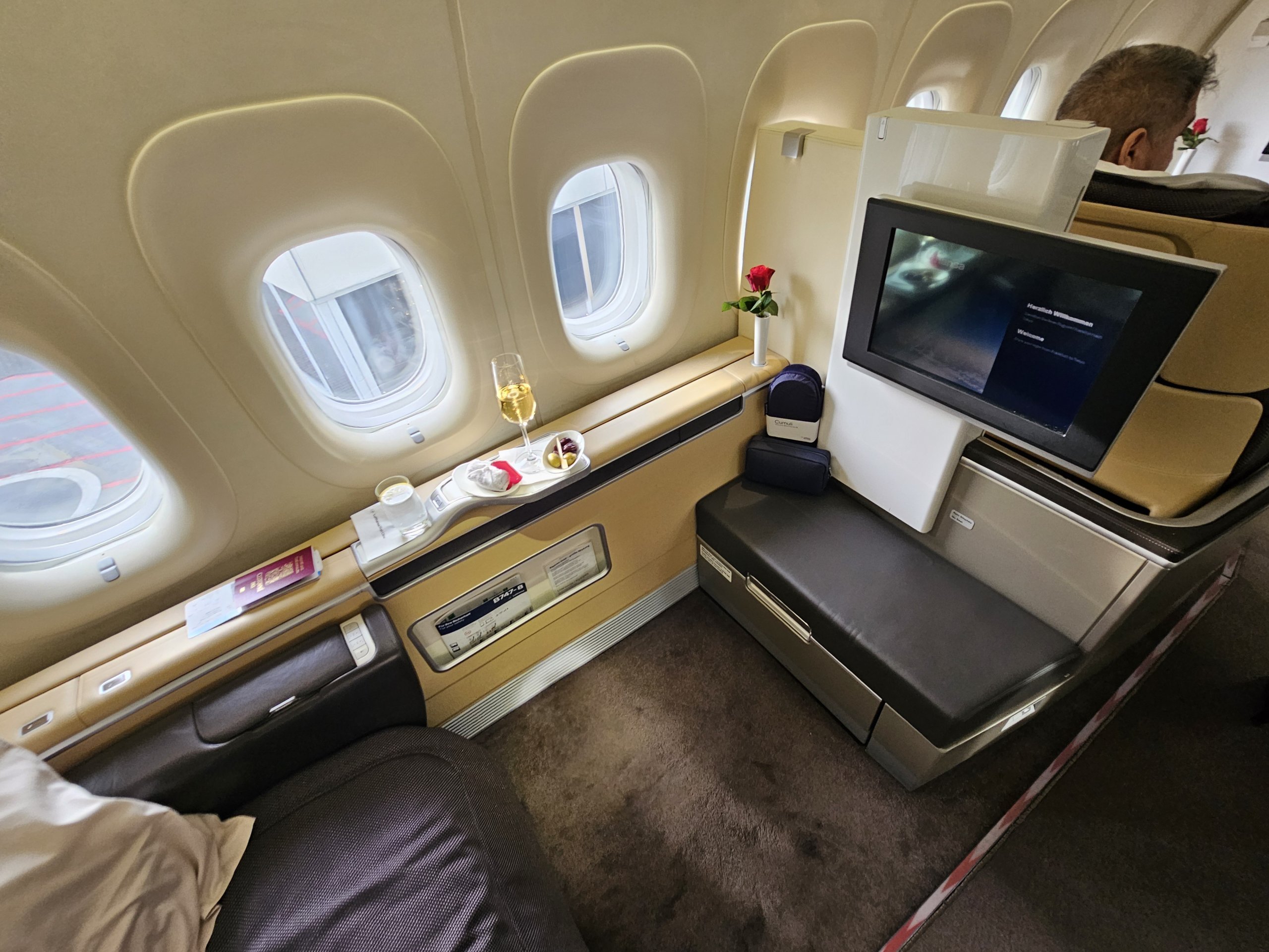Αν πετούσα με διαφορετικό αεροπλάνο, πιθανόν να ήταν χειρότερα. Αλλά η καμπίνα της πρώτης θέσης στο εμβληματικό Boeing 747-8, τοποθετημένη ακριβώς στη μύτη όπου το αεροπλάνο στενεύει, δημιουργεί απλώς μια ακαταμάχητη και πολύ premium αίσθηση!