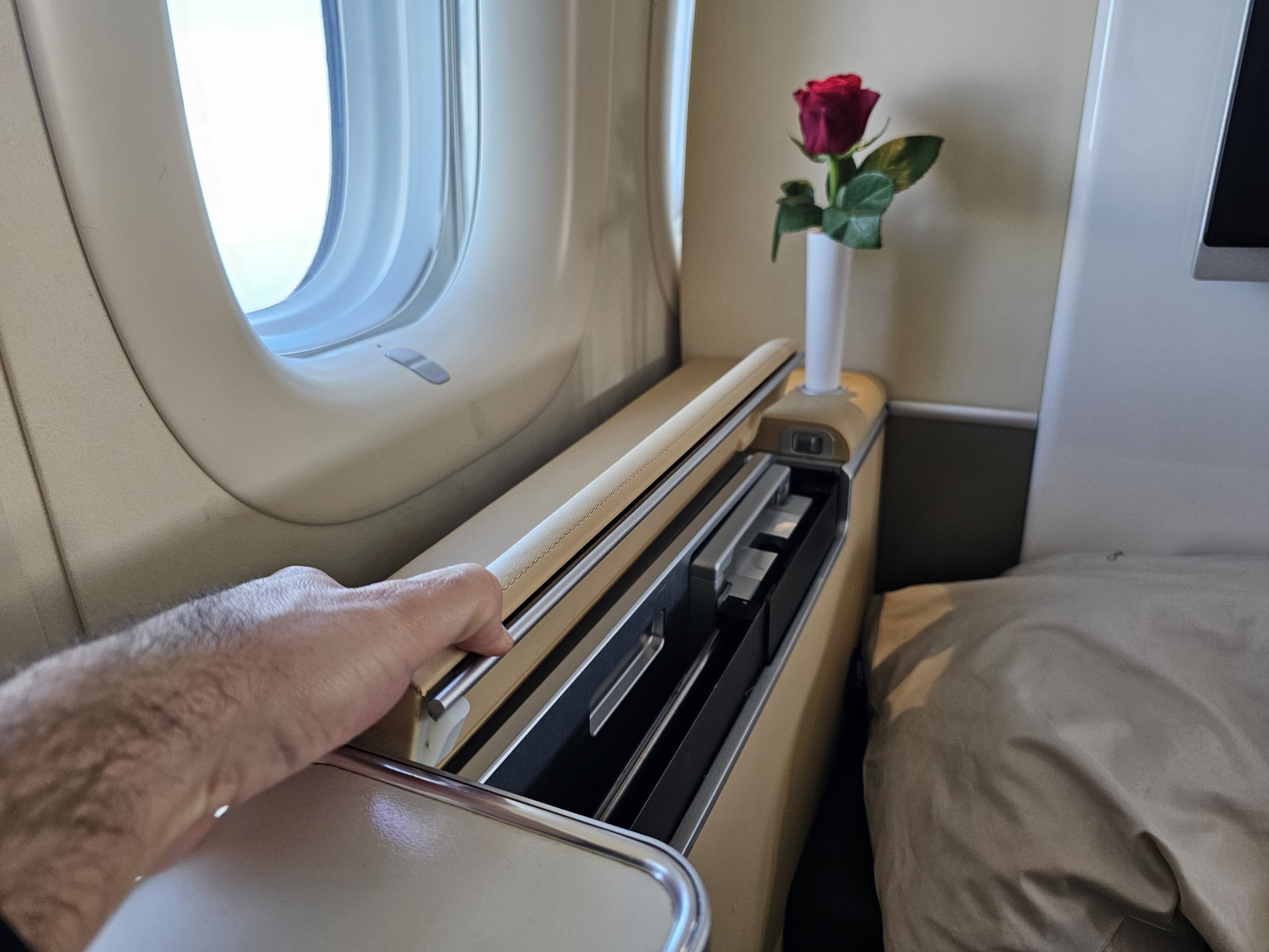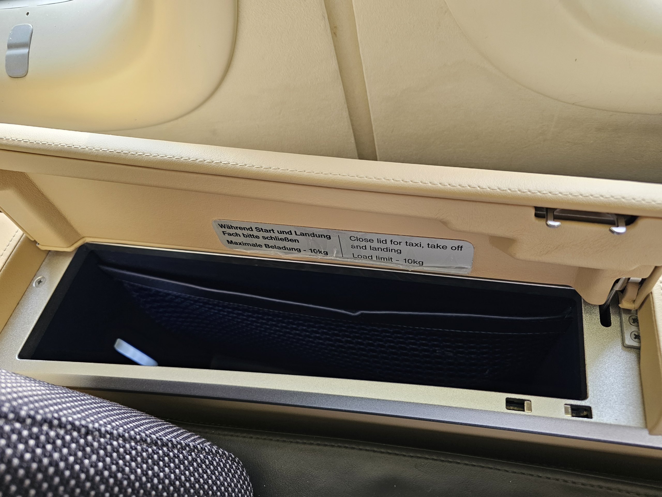 Έχω δύο ευρύχωρες θήκες μεταξύ του καθίσματος και των παραθύρων που μπορούν να χωρέσουν όλα τα έγγραφά μου, όπως διαβατήριο, κάρτες επιβίβασης, αλλά ίσως και ένα μεγάλο τυπωμένο μενού ή μεγάλα ακουστικά.