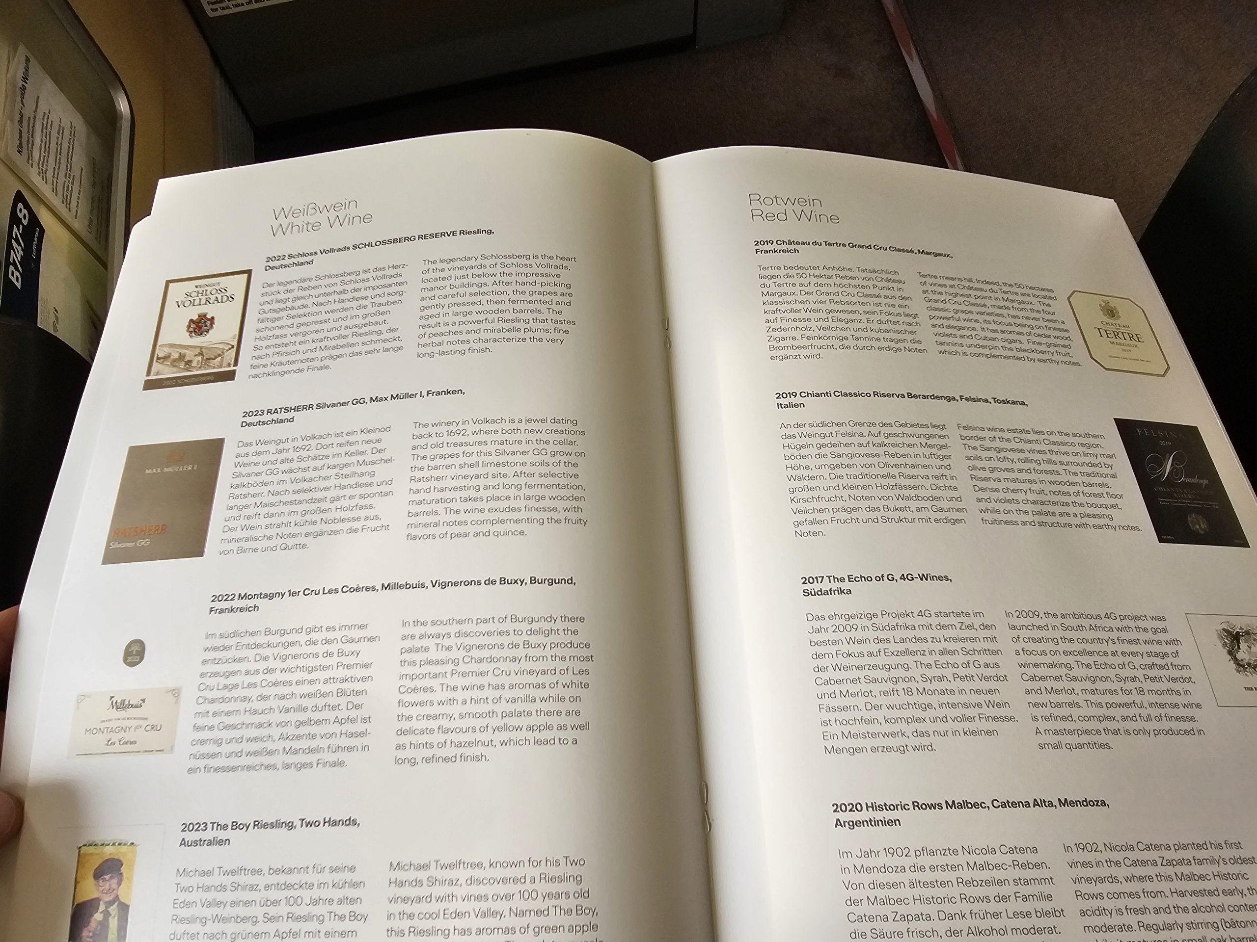 Πριν από την αναχώρηση, όλοι οι επιβάτες λαμβάνουν ένα τυπωμένο μενού και έναν πολύ περιεκτικό κατάλογο κρασιών.