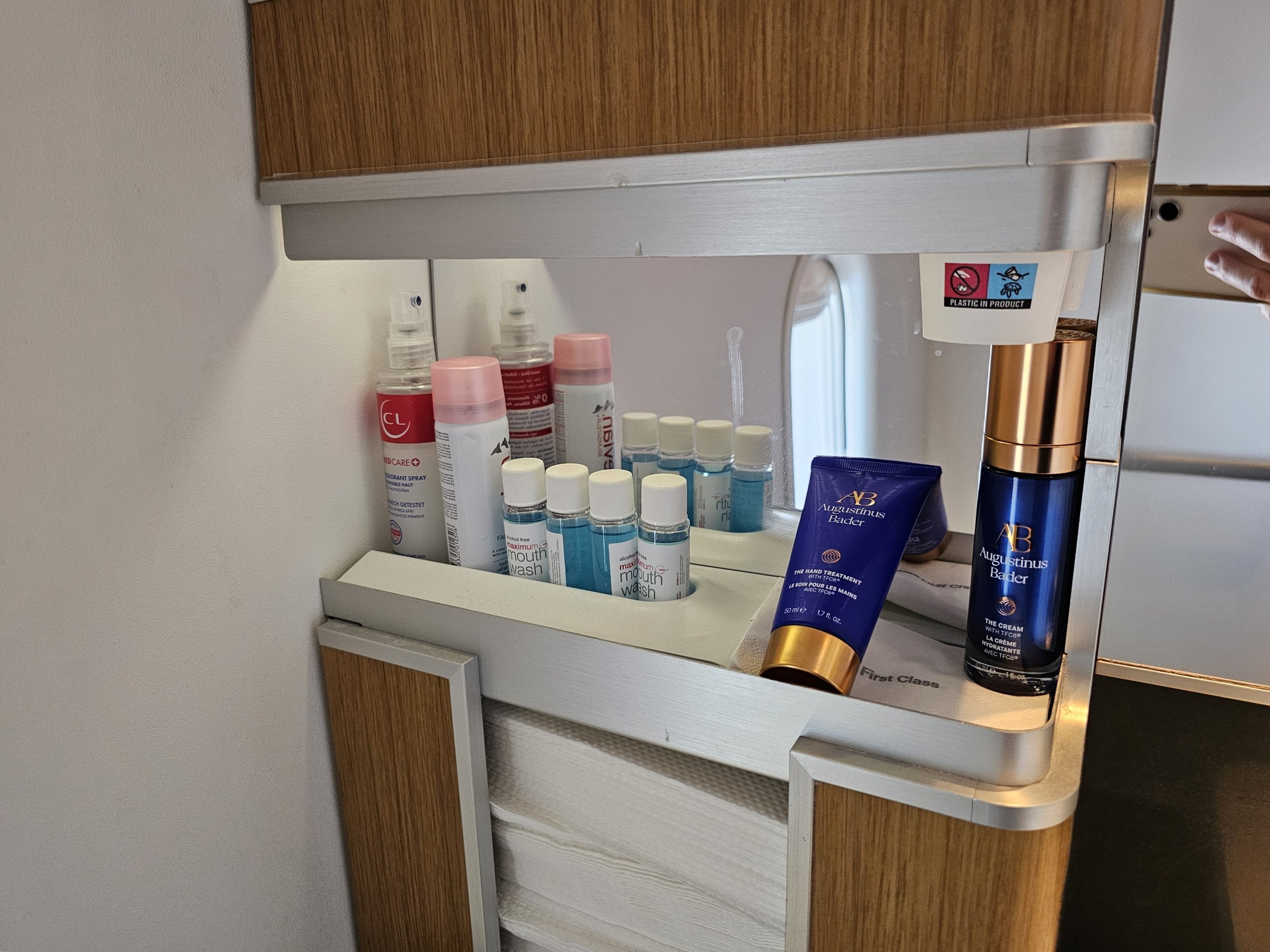 Μπορείτε να πάρετε ελεύθερα μπουκάλια με στοματικό διάλυμα, υγρά μαντηλάκια ή κρέμες χεριών στις τουαλέτες της πρώτης θέσης που είναι μόνο για τους επιβάτες.