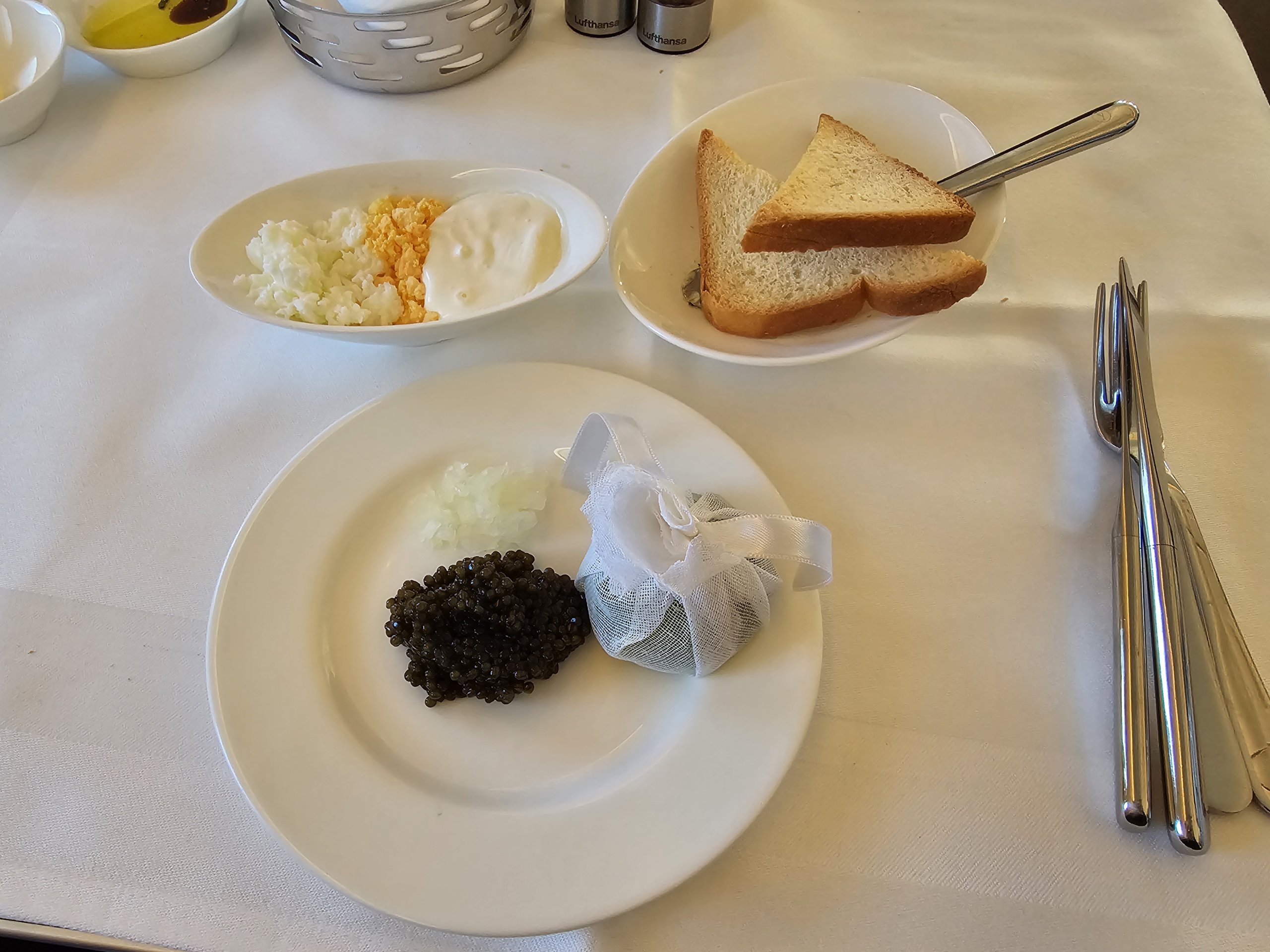 Πριν ακόμη από το κύριο σέρβις έρχεται το χαβιάρι - το χαρακτηριστικό προϊόν της πρώτης θέσης της Lufthansa. Το σέρβις χαβιαριού είναι απλώς μια έννοια σε αυτή την αεροπορική εταιρεία που όλοι οι τακτικοί επιβάτες και οι λάτρεις των πτήσεων είναι εξοικειωμένοι με αυτήν.