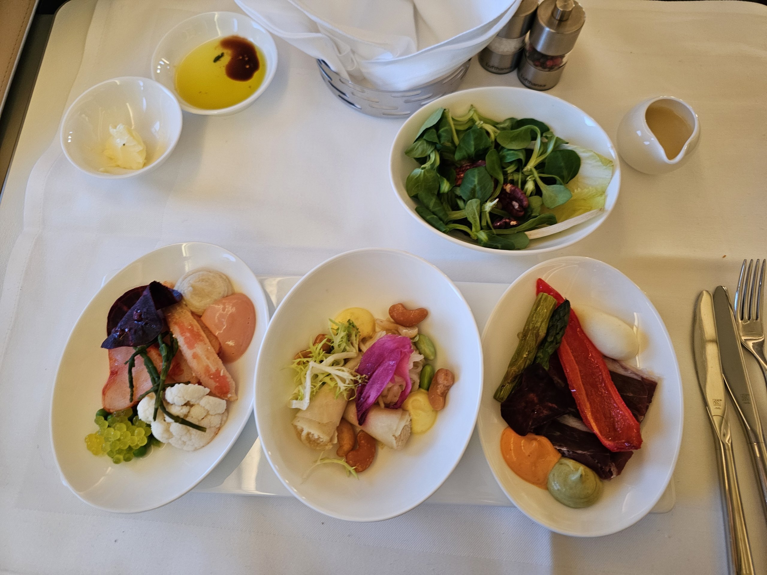 Το ορεκτικό είναι πολύ φρέσκο, πολύχρωμο, ελαφρύ και νόστιμο! Μου αρέσει η παρουσίαση και σε σύγκριση με την υπηρεσία της business class, υπάρχει περισσότερο φαγητό και πολύ μεγαλύτερη ποικιλία.