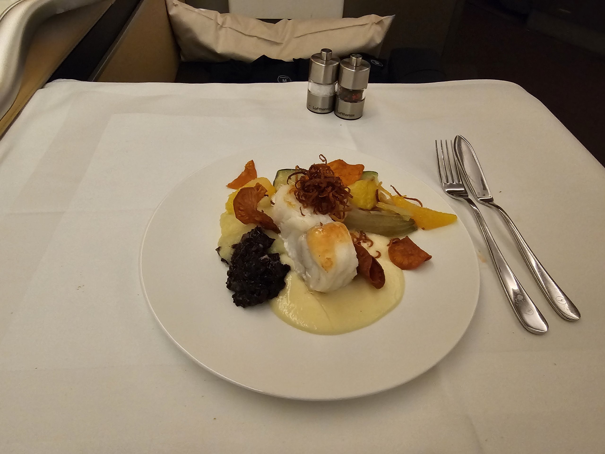 Για το κυρίως πιάτο, επιλέγω το ψάρι - πεσκαντρίτσα - με σάλτσα Beurre Blanc. Αυτή τη φορά η παρουσίαση για μένα είναι πολύ χειρότερη από τα ορεκτικά, αλλά το πιάτο είναι νόστιμο και κυρίως ελαφρύ. Ακριβώς όπως το φαντάζομαι κατά τη διάρκεια μιας πτήσης μεγάλων αποστάσεων.