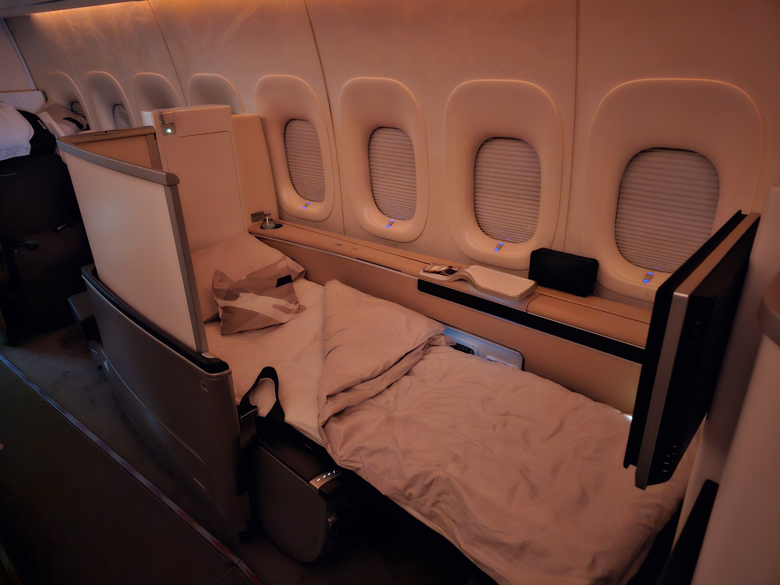 Έχω το κρεβάτι μου διπλωμένο πίσω στο κάθισμα περίπου 2 ώρες πριν από την προσγείωση. Συνολικά, κοιμήθηκα περίπου λιγότερο από 7 ώρες.