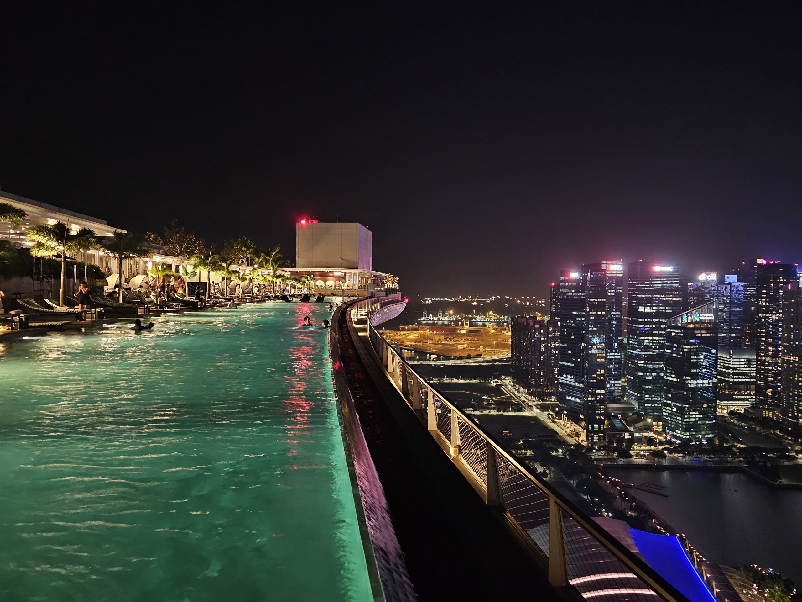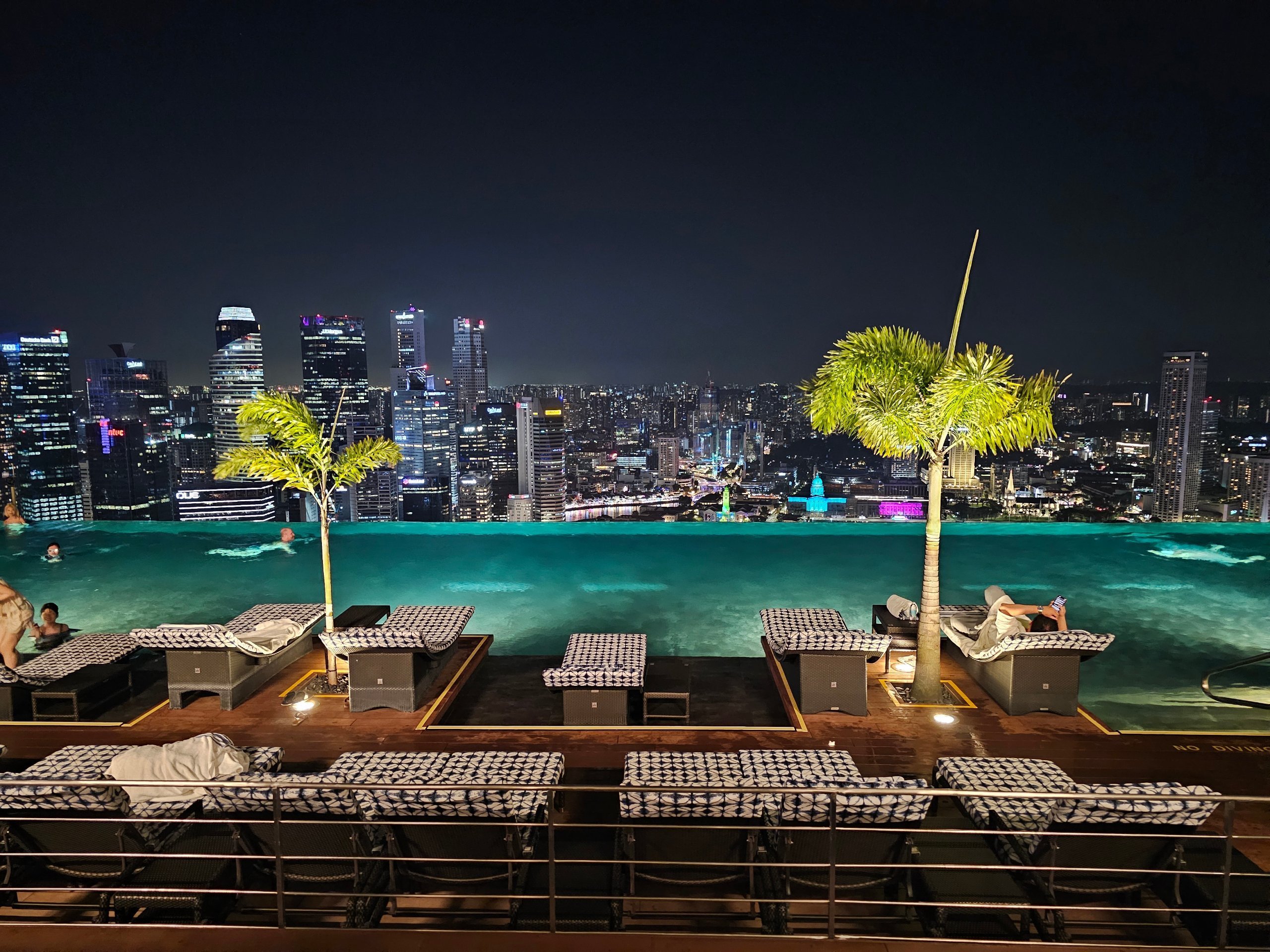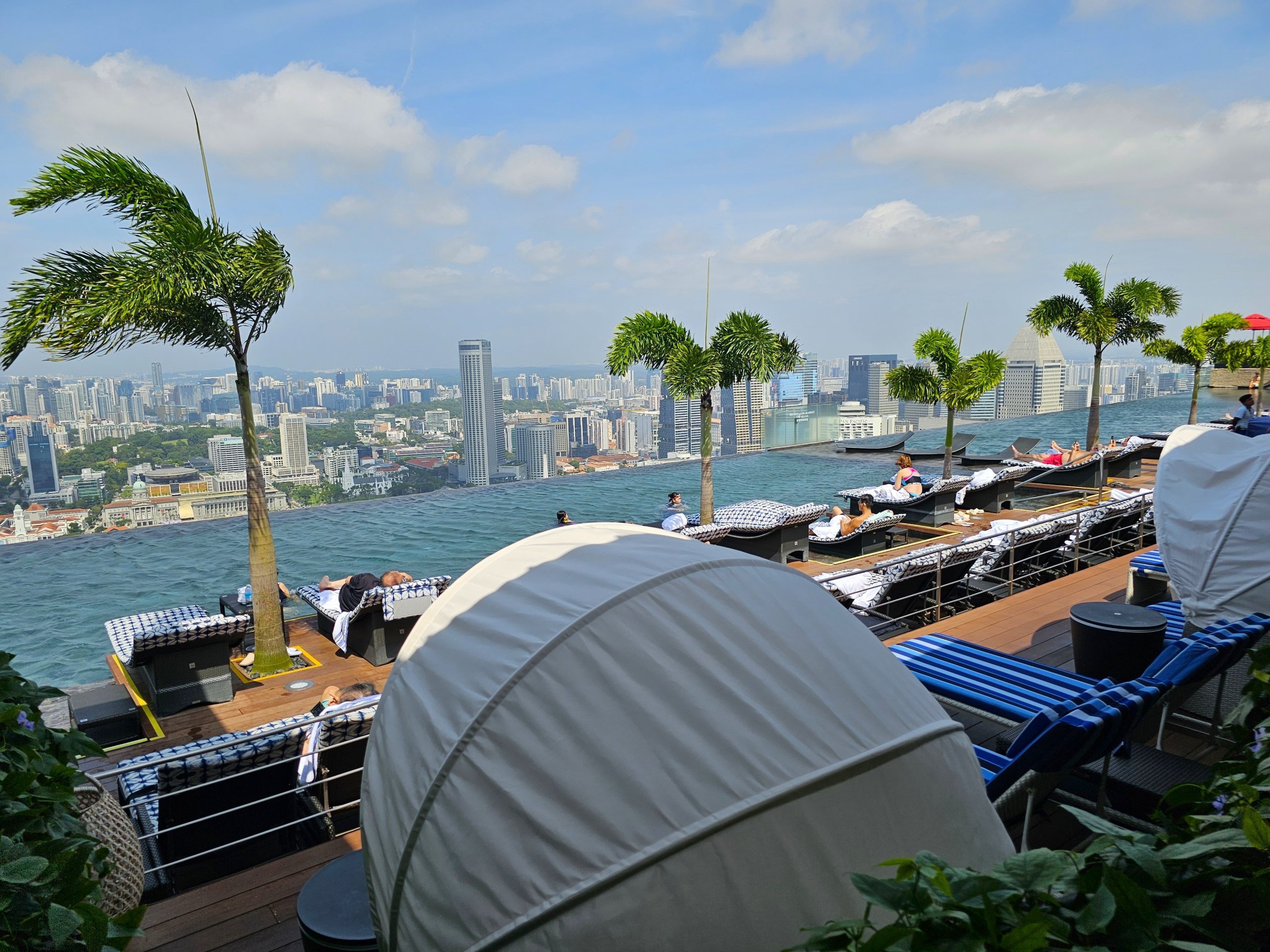 Από το μήκος της πισίνας, το κέντρο της Σιγκαπούρης βρίσκεται στην παλάμη του χεριού σας. Και αν περπατήσετε στην άλλη πλευρά της οροφής, μπορείτε να δείτε τους Κήπους του Κόλπου και εκατοντάδες φορτηγά πλοία στο βάθος στην ανοιχτή θάλασσα.