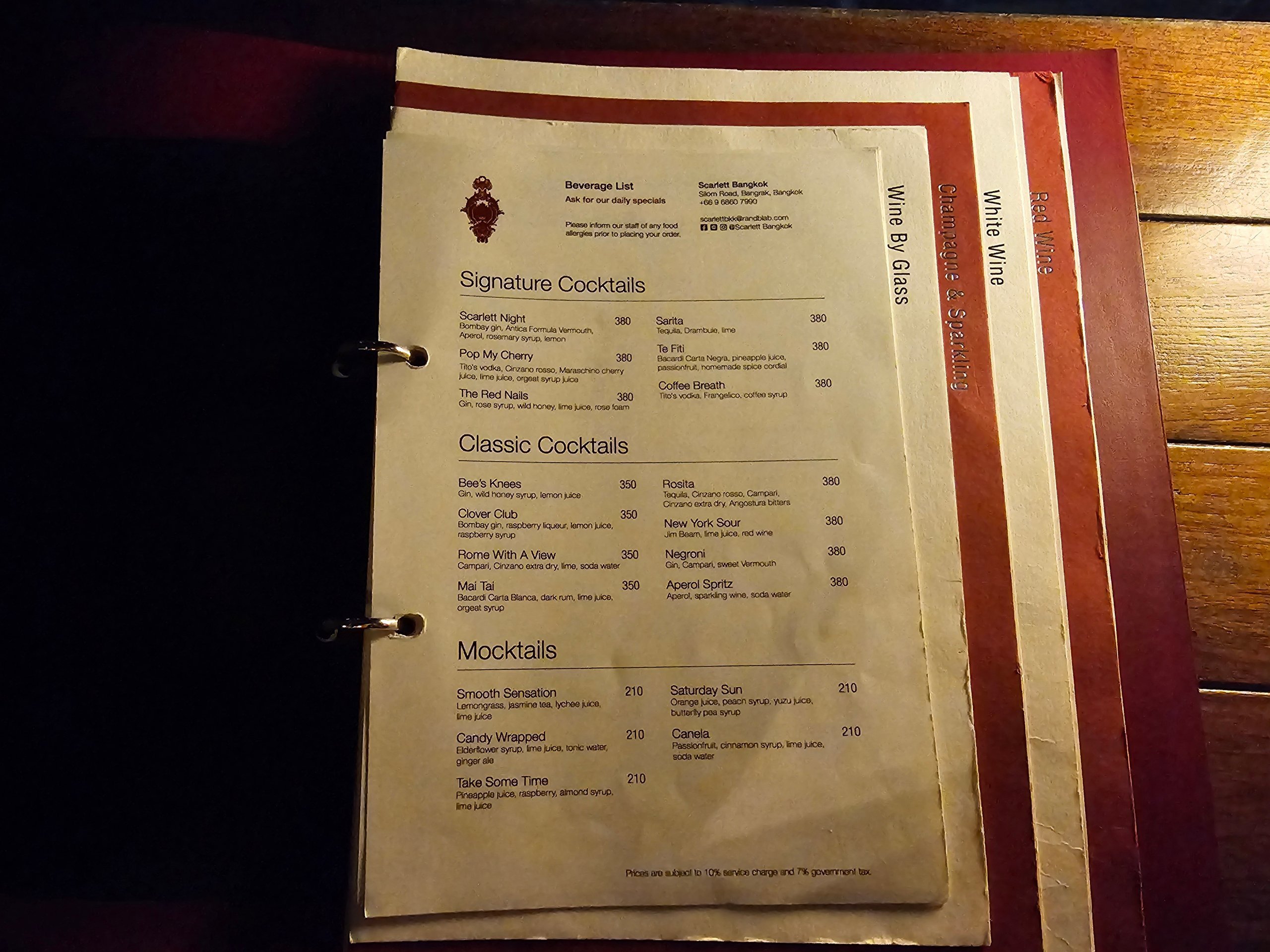 Πήγαμε στο Scarlett μόνο για ένα βραδινό ποτό και αυτό ήταν μάλλον απογοητευτικό για εμάς. Σίγουρα απολαύσαμε τα ποτά μας περισσότερο στα άλλα μπαρ της Μπανγκόκ που περιγράφουμε σε αυτό το άρθρο: