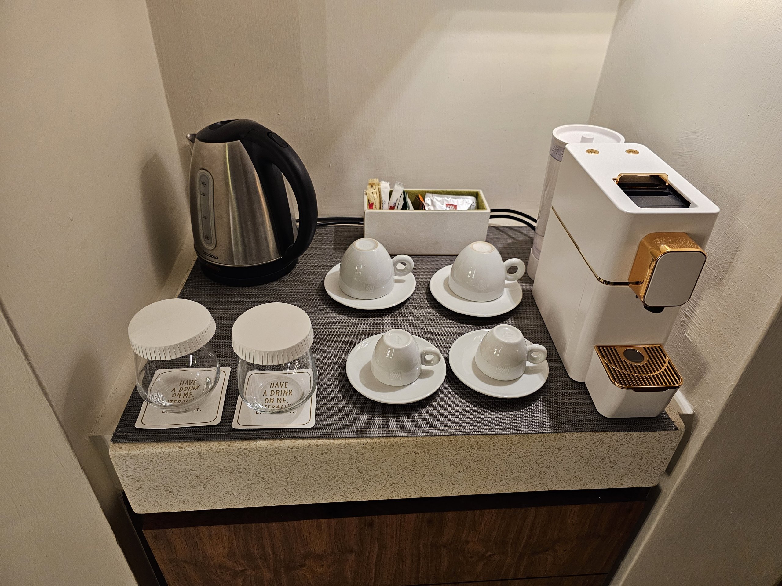 Στο ψυγείο υπάρχει καφετιέρα με κάψουλα, βραστήρας και μια επιλογή τσαγιών.