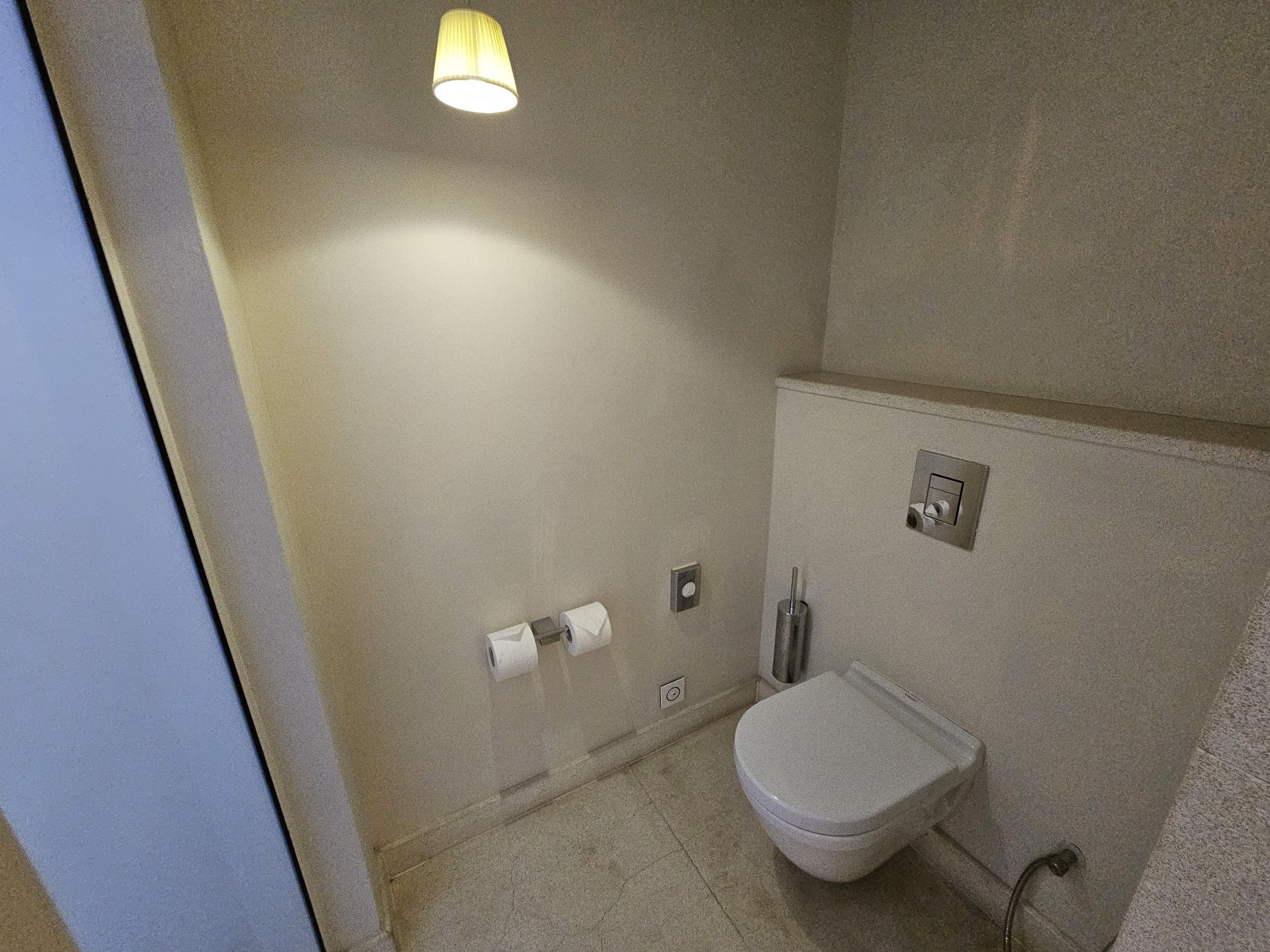 Η τουαλέτα χωρίζεται από το υπόλοιπο μπάνιο με πόρτα. Δεν υπάρχει μπιντέ αλλά μόνο ένα ντους μπιντέ.
