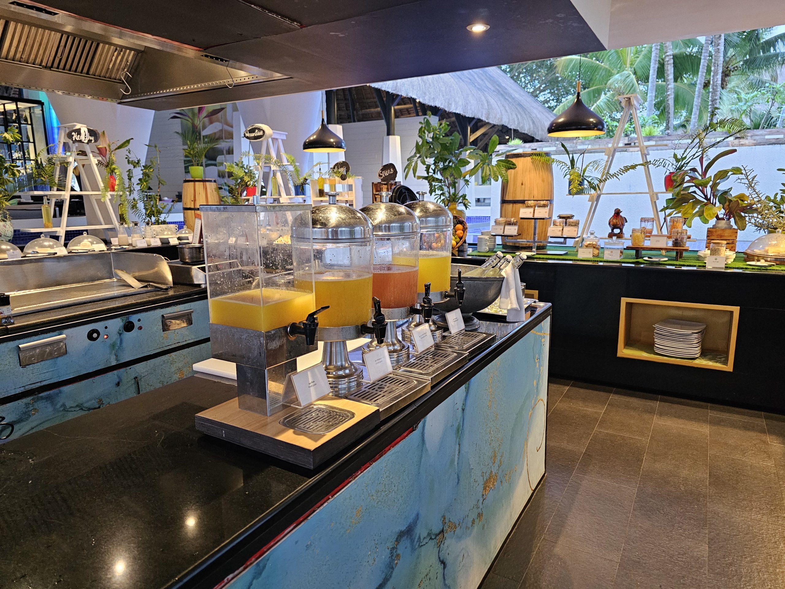 Το πρωινό πραγματοποιείται στο μεγαλύτερο κτίριο του θέρετρου, το οποίο στεγάζει το εστιατόριο Flamboyant και το μπαρ Takamaka.