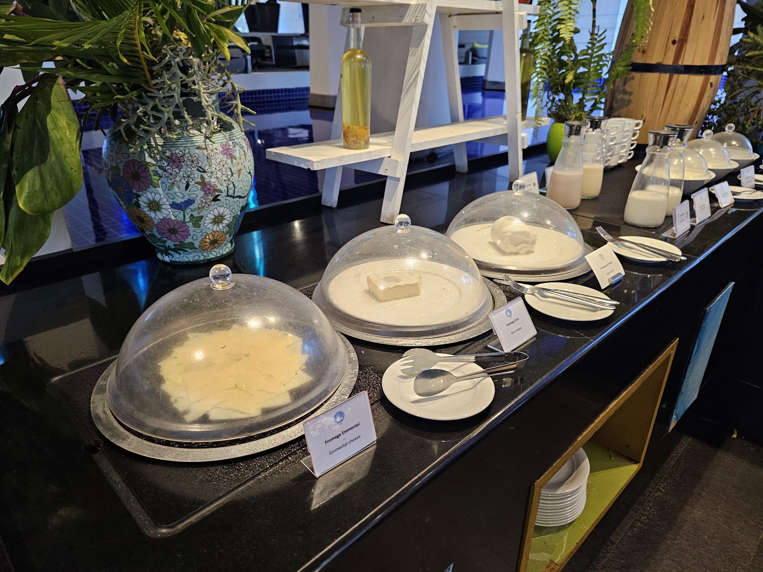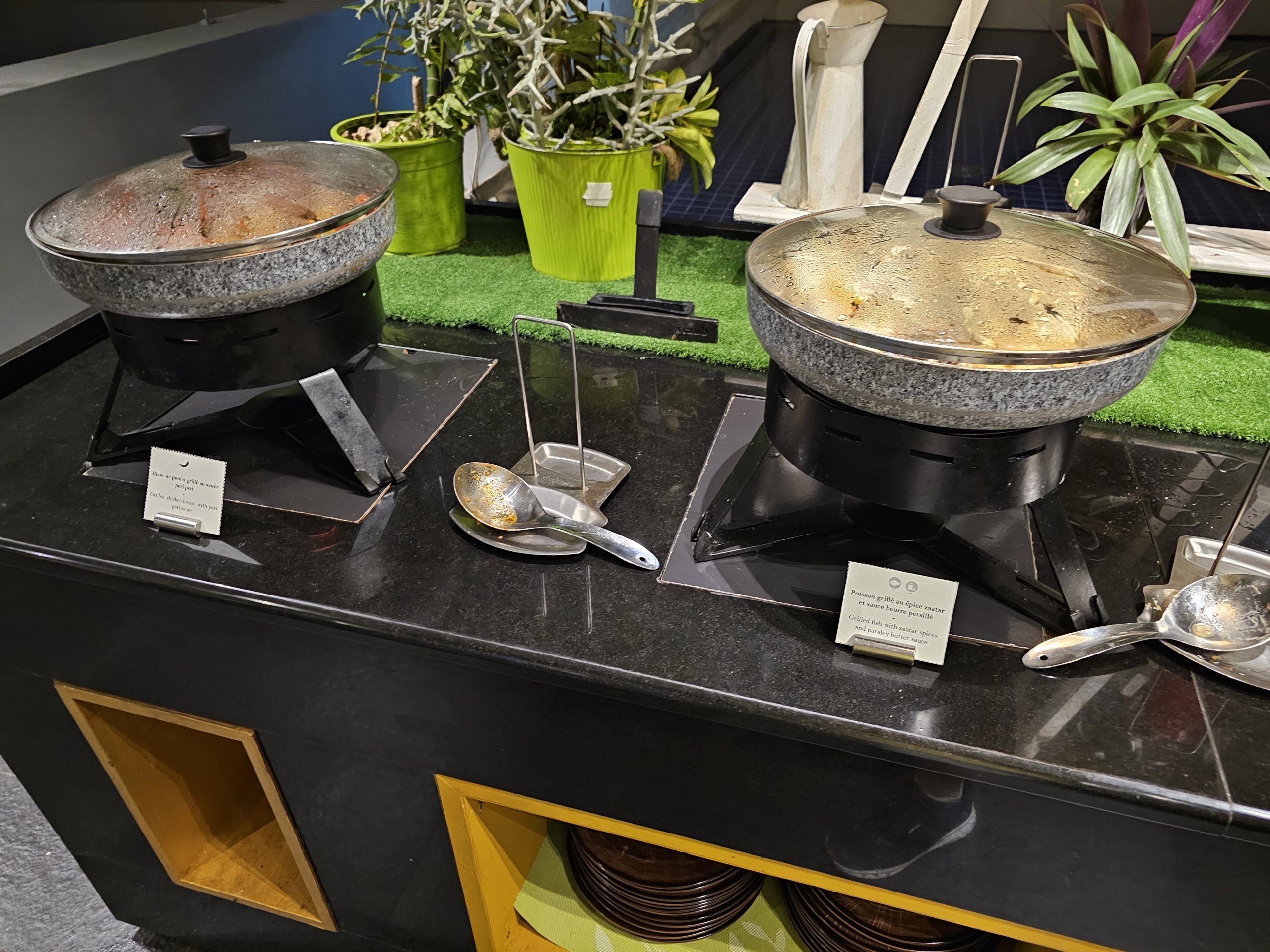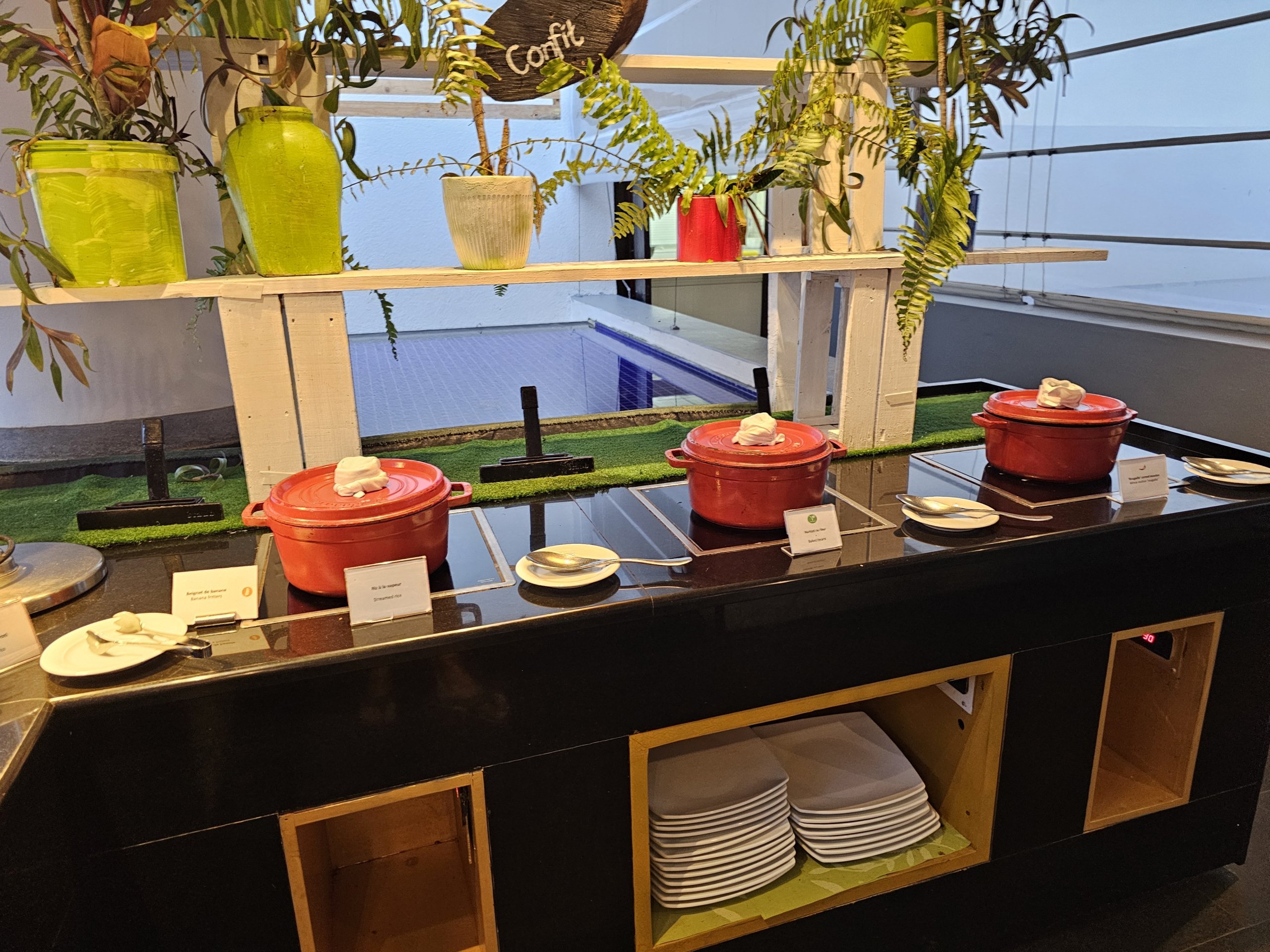 Η επιλογή περιλαμβάνει τα τυπικά λουκάνικα, μπέικον, φασόλια, αυγά με πολλούς τρόπους και 3 τυπικά ζεστά πιάτα, όπως το τυπικό rougaille.