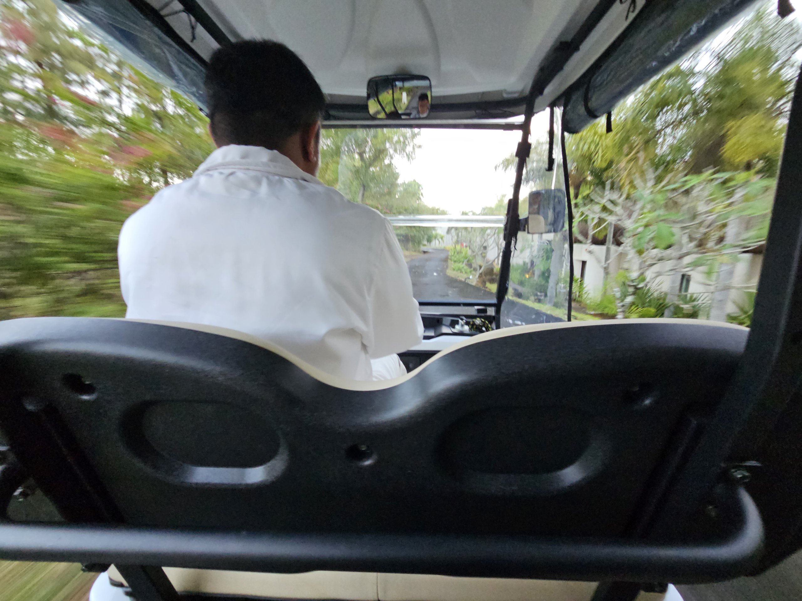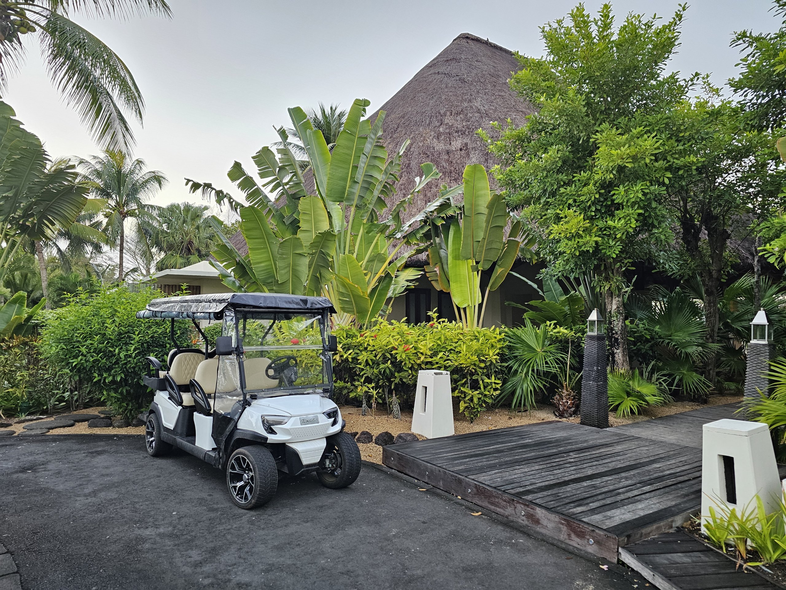 Η είσοδος βρίσκεται περίπου 500 μέτρα από τη ρεσεψιόν, στην οποία με μεταφέρουν με τις αποσκευές μου με ηλεκτρικό αμαξίδιο του γκολφ. Δεν περιμένω ούτε λεπτό, τα αμαξίδια είναι σταθμευμένα στο περίπτερο υποδοχής.