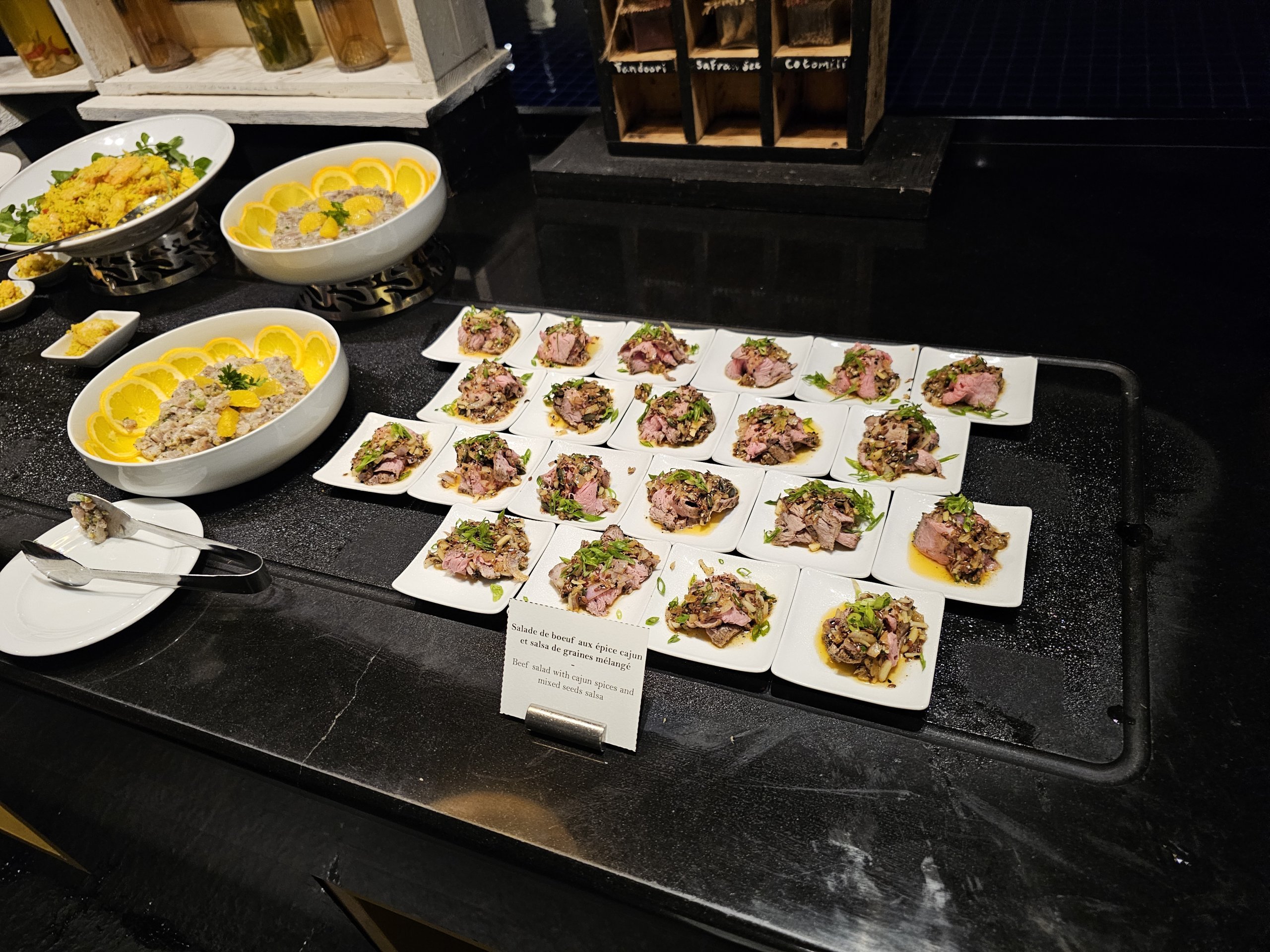 Ο κρύος και γλυκός μπουφές περιλαμβάνει μια αρκετά καλή επιλογή δυτικής κουζίνας (τυριά, ζαμπόν), μια μεγάλη ποικιλία από φρούτα, σαλάτες λαχανικών και spreads, καθώς και μια καλή ποικιλία από γλυκά και αρτοσκευάσματα.