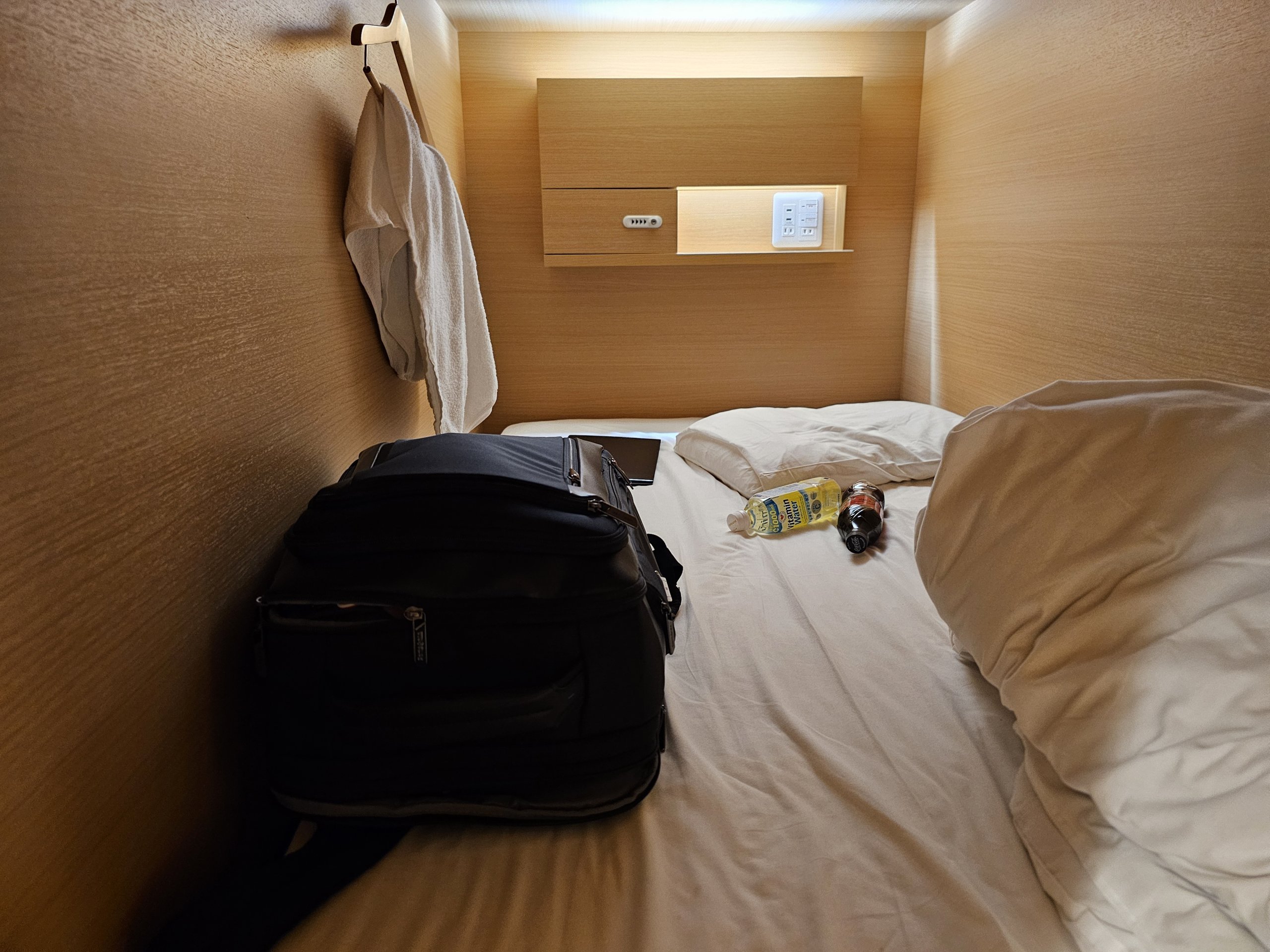 Παρόλο που δεν υπάρχει αποθηκευτικός χώρος στην κάψουλα, επειδή το στρώμα είναι σχετικά φαρδύ, καταλήγω να έχω το σακίδιο και τα δύο μπουκάλια ποτού ακριβώς δίπλα μου.