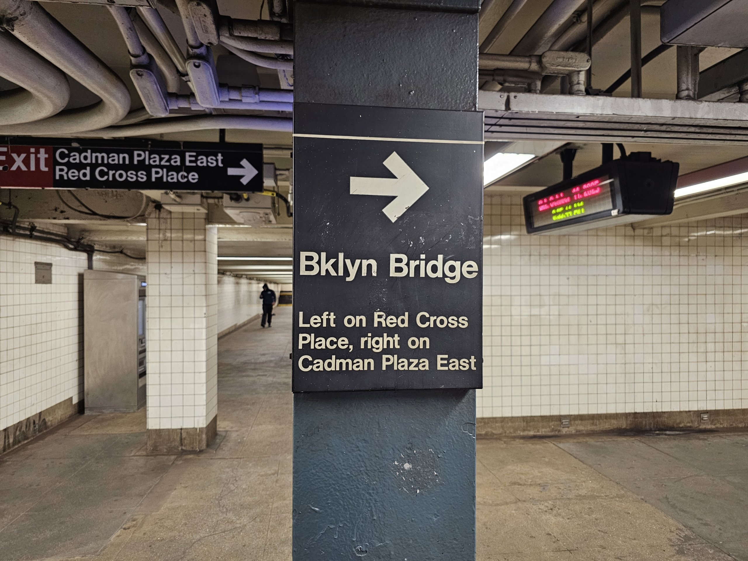 Συνιστούμε να χρησιμοποιήσετε το σταθμό High Street, ο οποίος είναι ο πλησιέστερος και από τον οποίο υπάρχουν απευθείας πινακίδες προς τη γέφυρα του Μπρούκλιν.