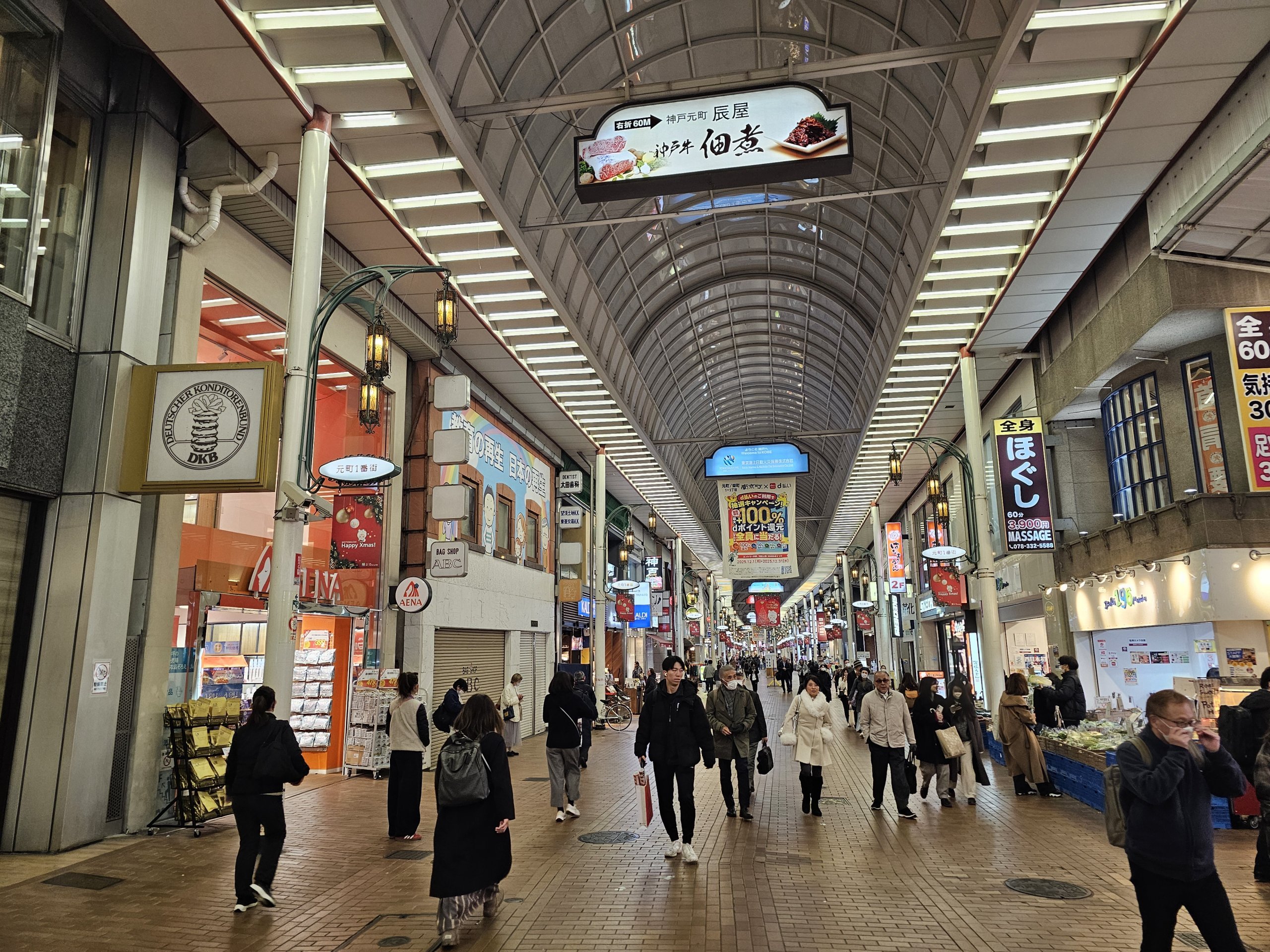 Θα βρείτε ένα μείγμα από μικρές μπουτίκ, φαρμακεία, καφετέριες και εστιατόρια, αλλά η ατμόσφαιρα είναι πιο ήσυχη από ό,τι, ας πούμε, στην Dotonbori στην Οσάκα ή στην αγορά Nishiki στο Κιότο.