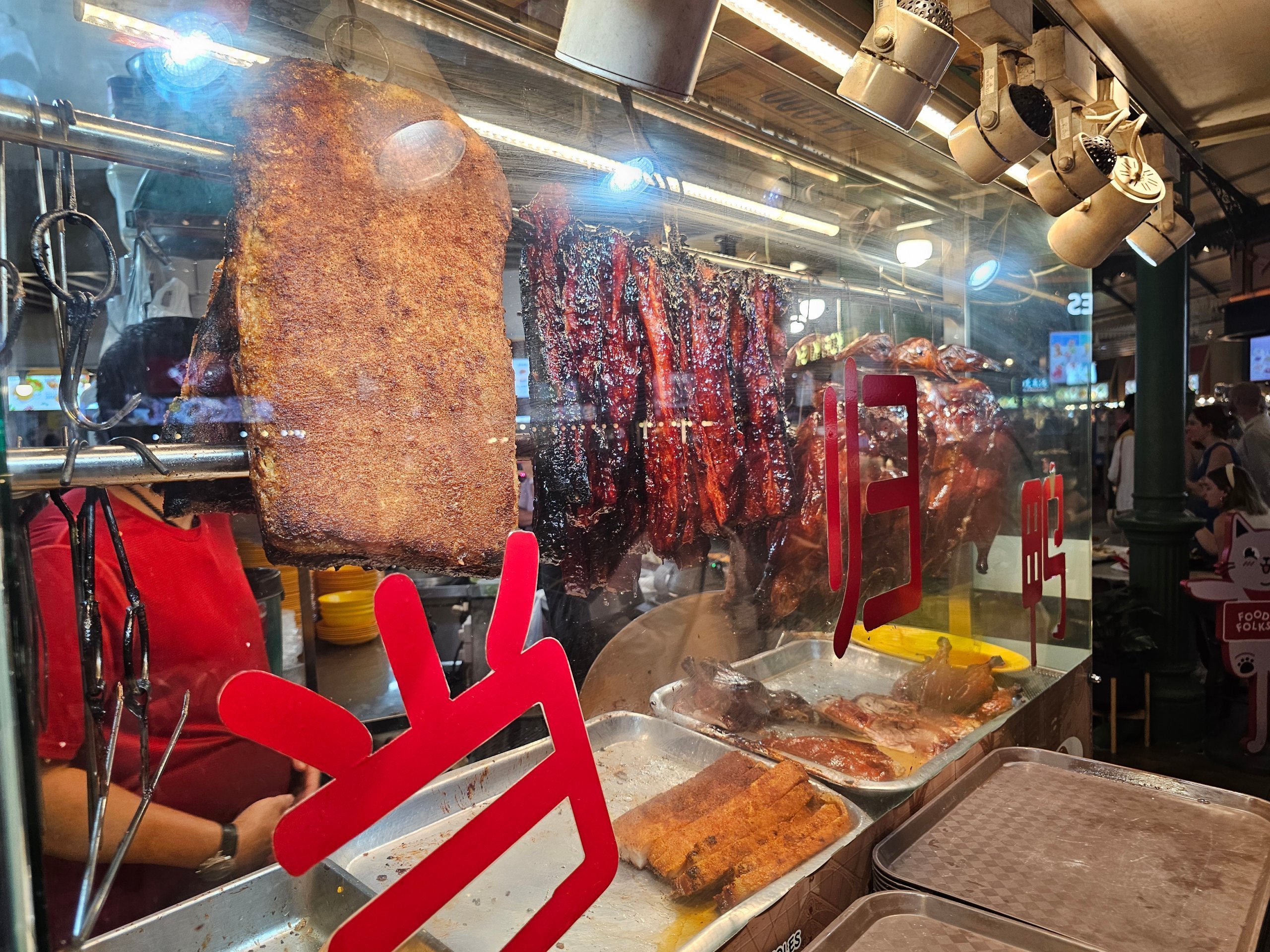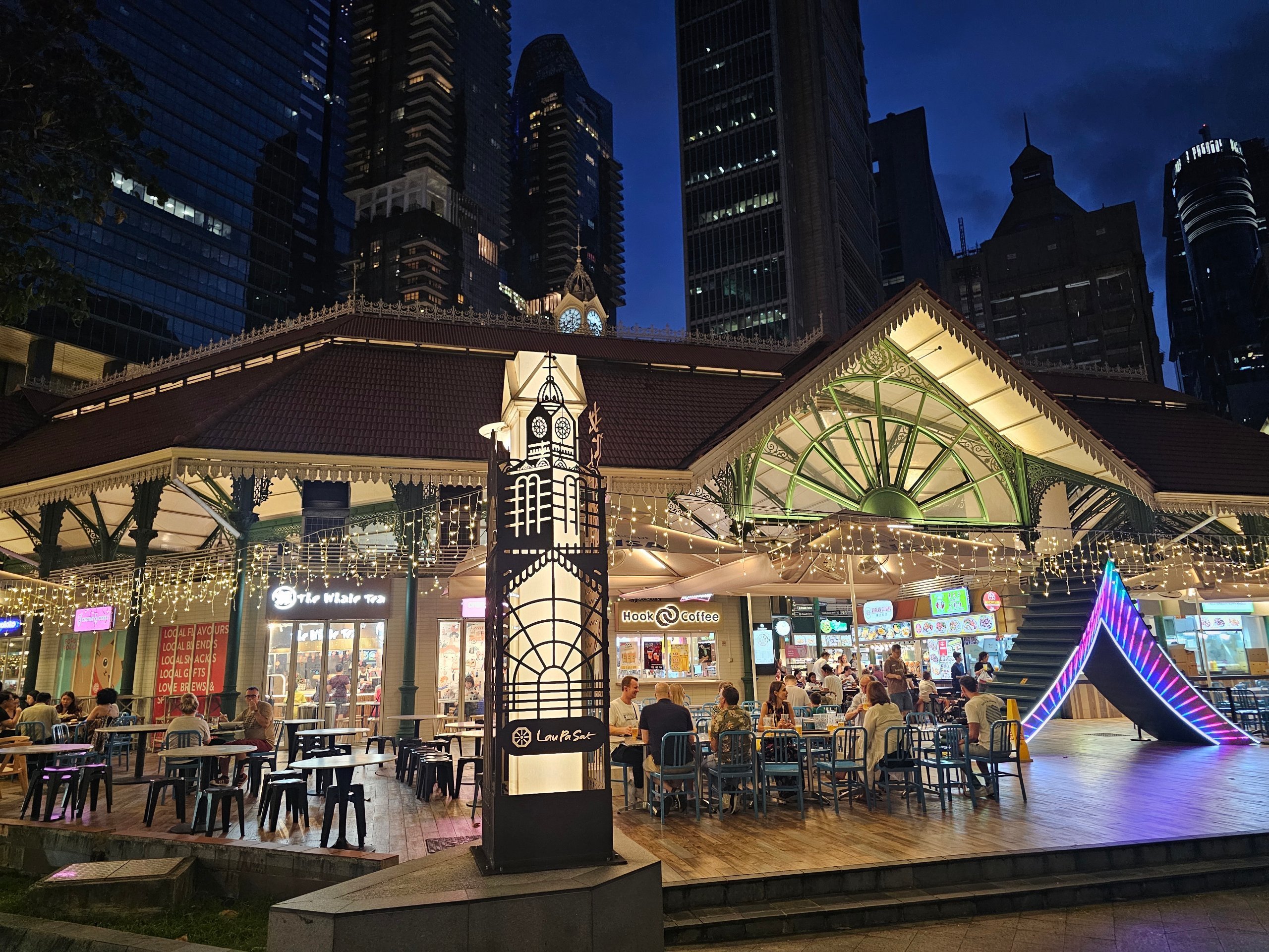 Η ατμόσφαιρα είναι εντελώς διαφορετική από το εσωτερικό της αγοράς - η μυρωδιά του ψητού κρέατος, ο καπνός από τις ψησταριές και η έντονη νυχτερινή ζωή δημιουργούν μια από τις πιο εμβληματικές εμπειρίες street-food στη Σιγκαπούρη.