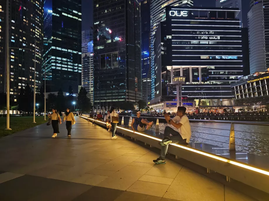 Η ομορφιά του αναδεικνύεται ιδιαίτερα στο νυχτερινό φωτισμό των ουρανοξυστών, στο ξενοδοχείο Marina Bay Sands, το οποίο διαθέτει μια παγκοσμίου φήμης πισίνα στην οροφή του, μια ρόδα λούνα παρκ και αγάλματα λιονταριών κατά μήκος του κόλπου.