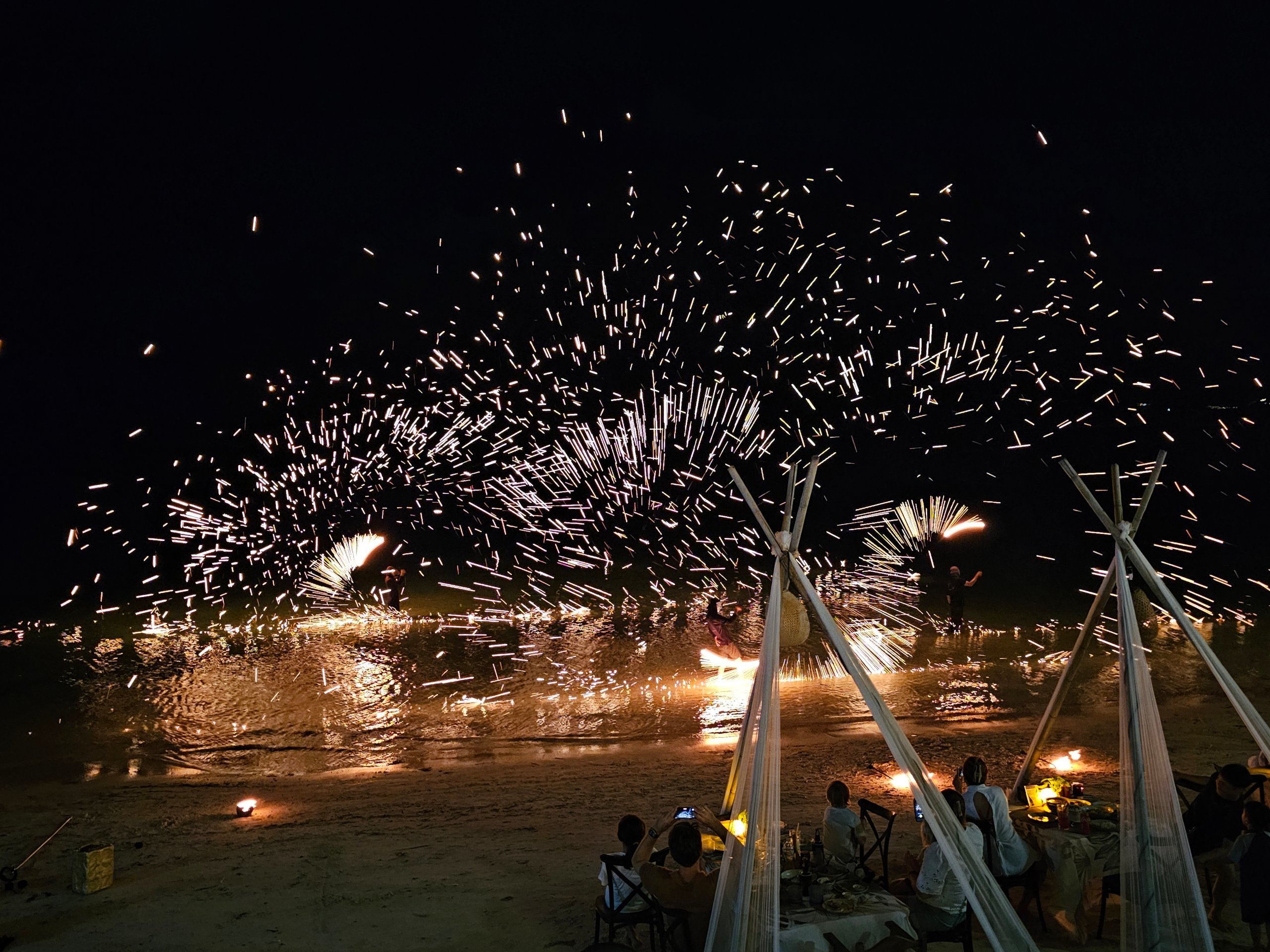 Το βράδυ γίνονται συχνά παραστάσεις με φωτιές ακριβώς στην παραλία, ειδικά στην κεντρική περιοχή. Η ατμόσφαιρα είναι χαλαρή και ανεπίσημη - περισσότερο ένα πάρτι ξυπόλυτων στην άμμο παρά μια επίσημη βραδιά σε κλαμπ.