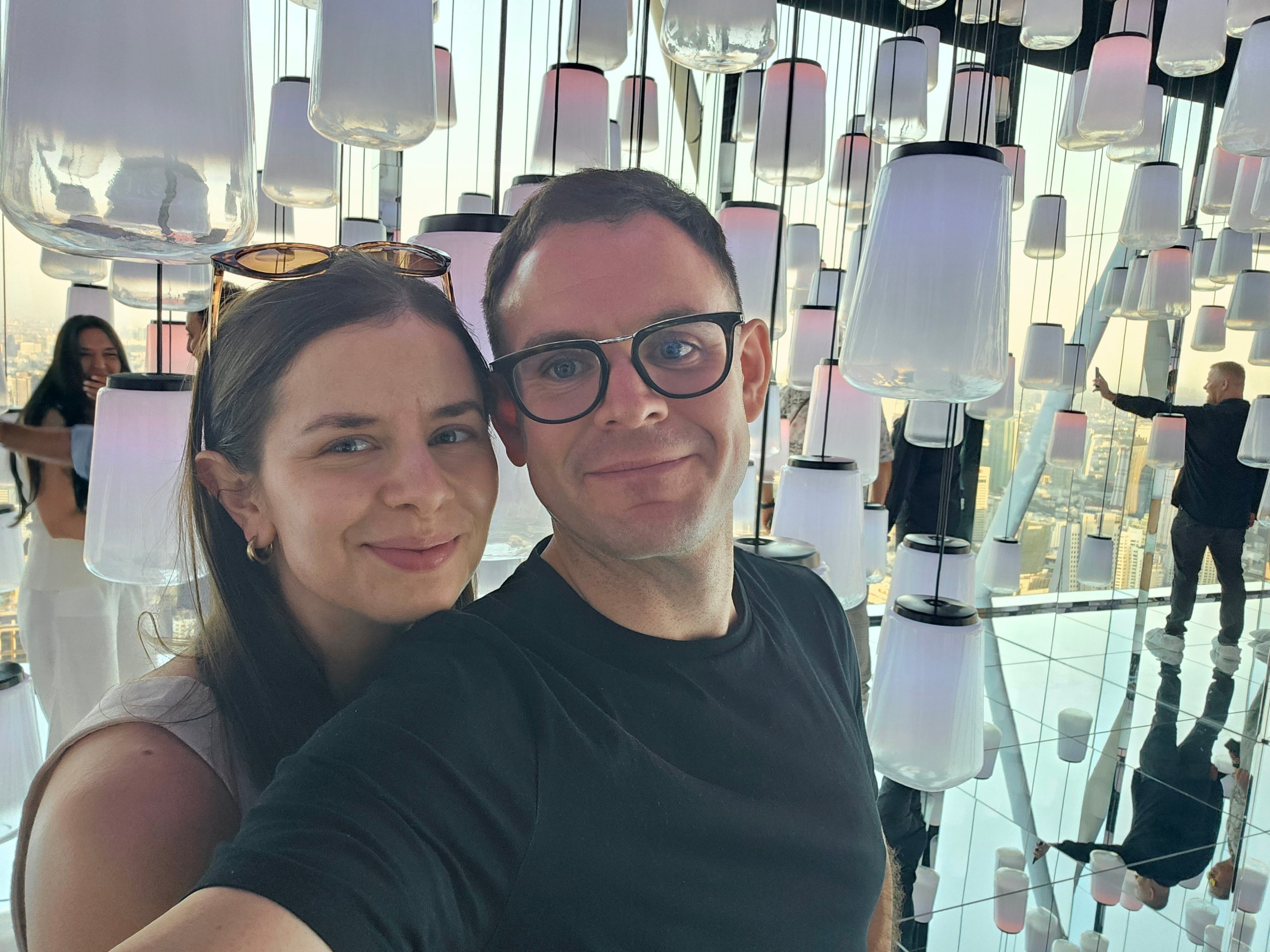 Ένα παρατηρητήριο δύο επιπέδων με καθρέφτη και θέα 360°, όπου αντανακλώνται όμορφα οι άνθρωποι και η πόλη στο βάθος.